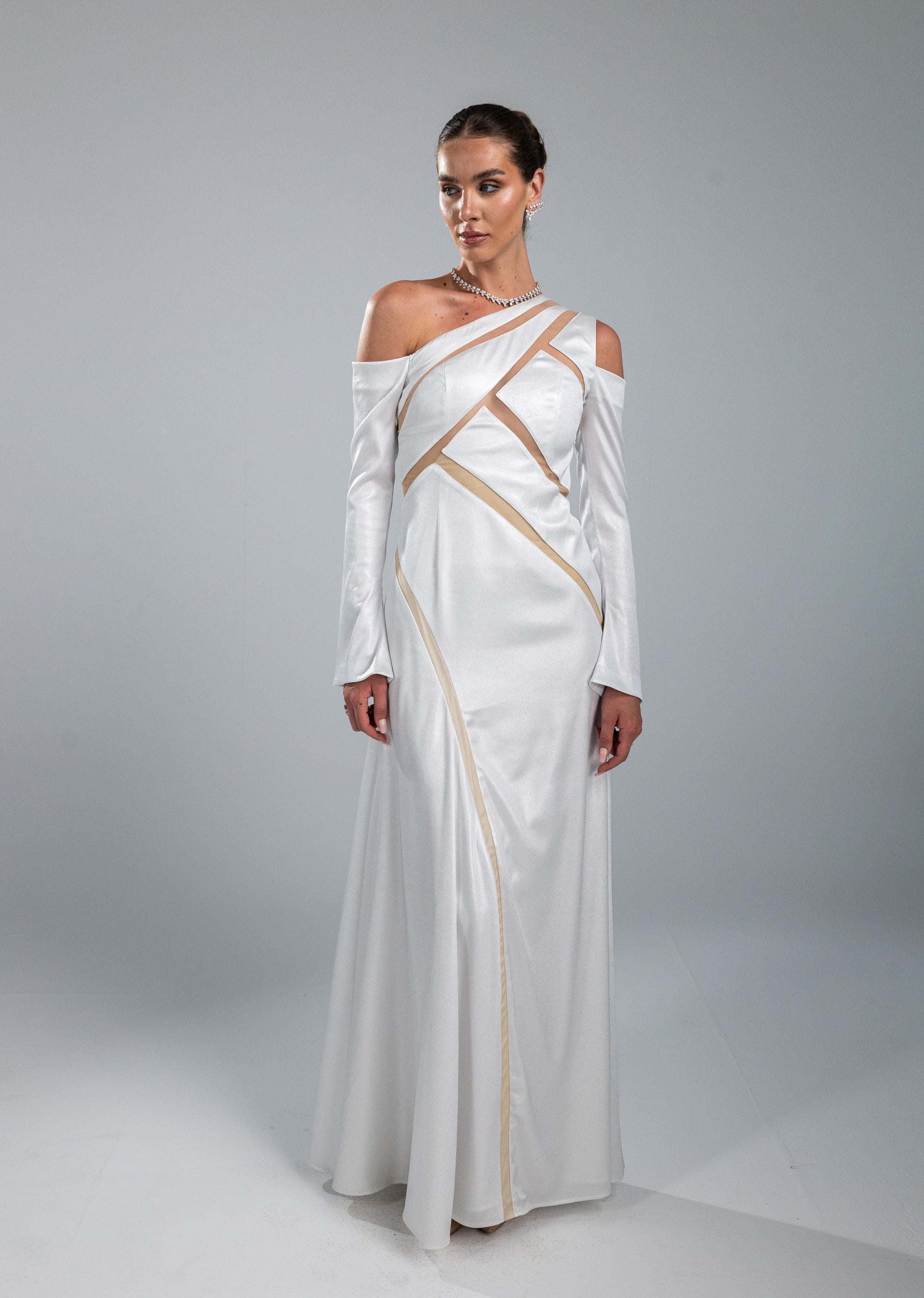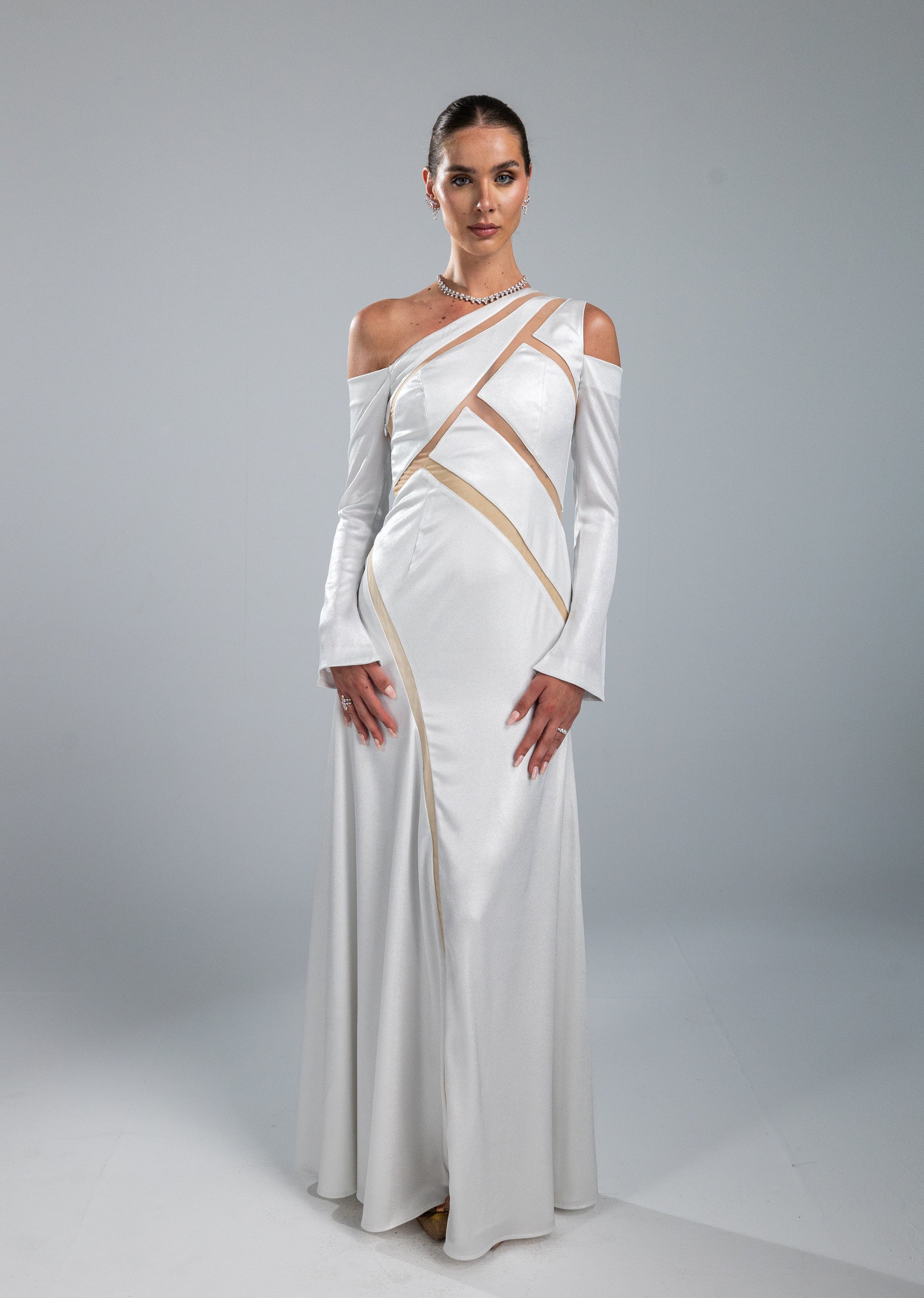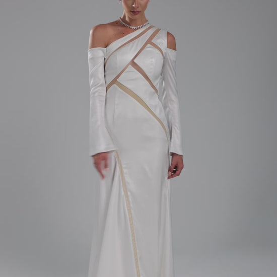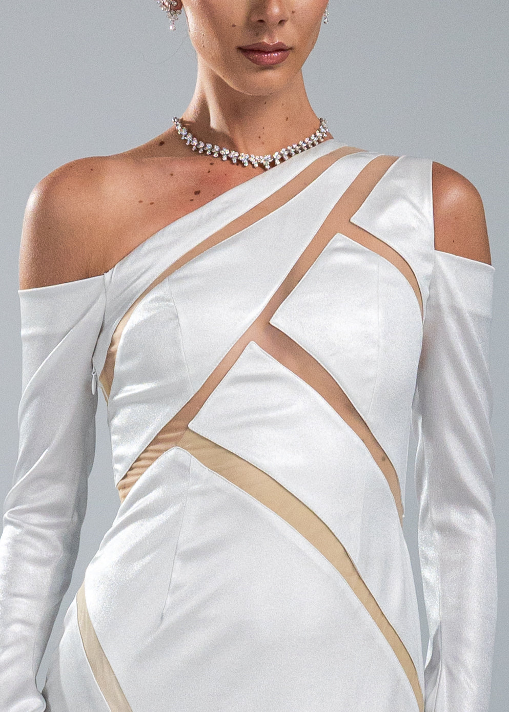 This dress is crafted from shiny satan fabric. The corsage is constructed from sheer, skin-tone tulle — a barely-there base upon which architectural panels of shiny satin are precisely placed, forming a striking geometric composition that wraps and reveals in equal measure. The long fitted sleeves add a dramatic look.