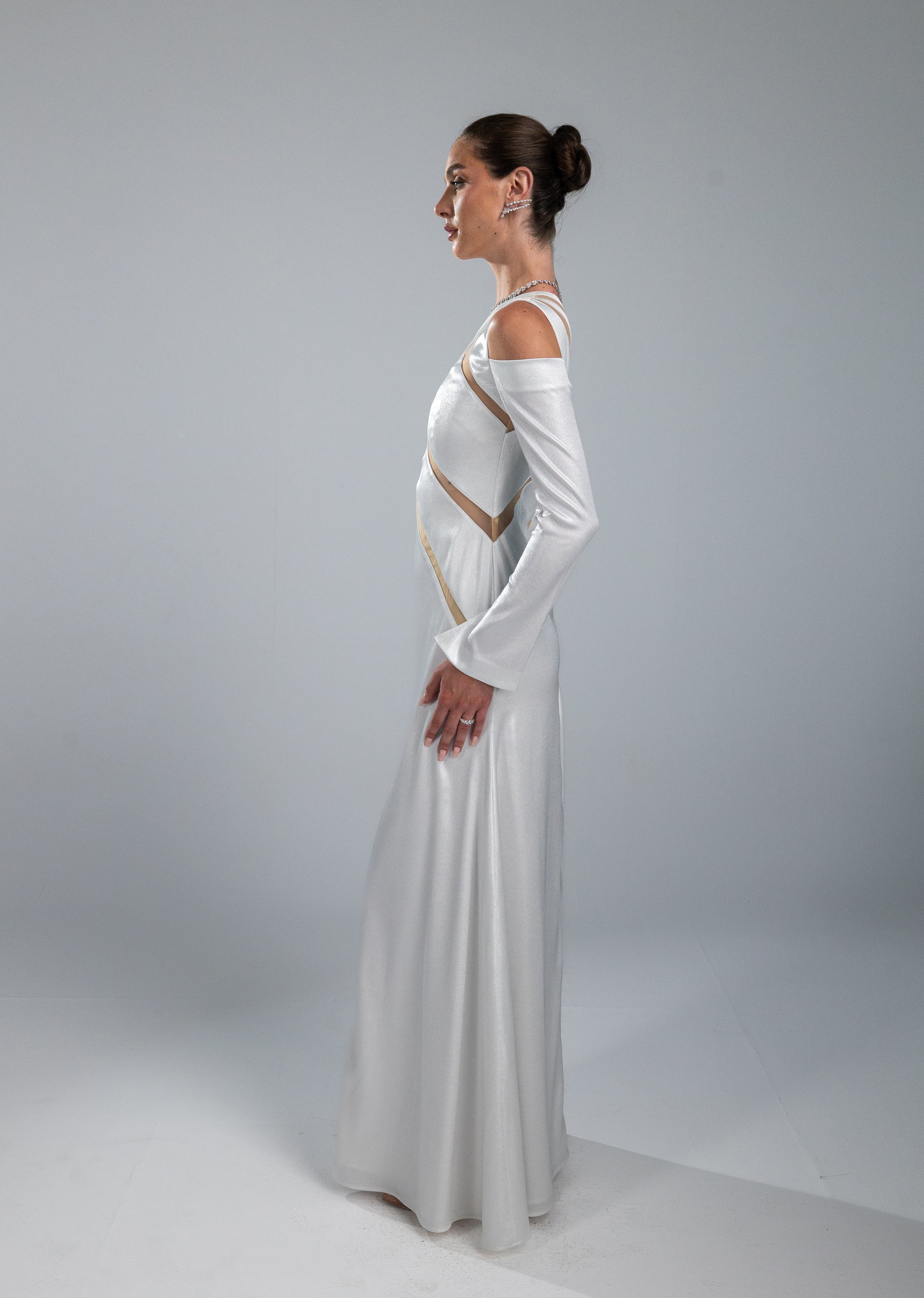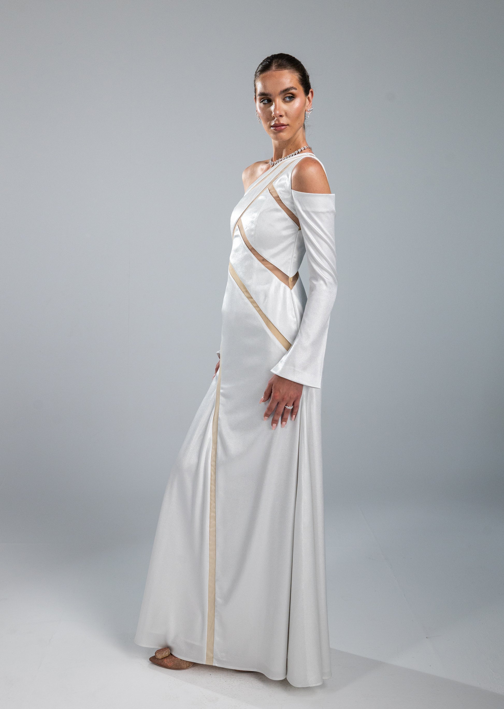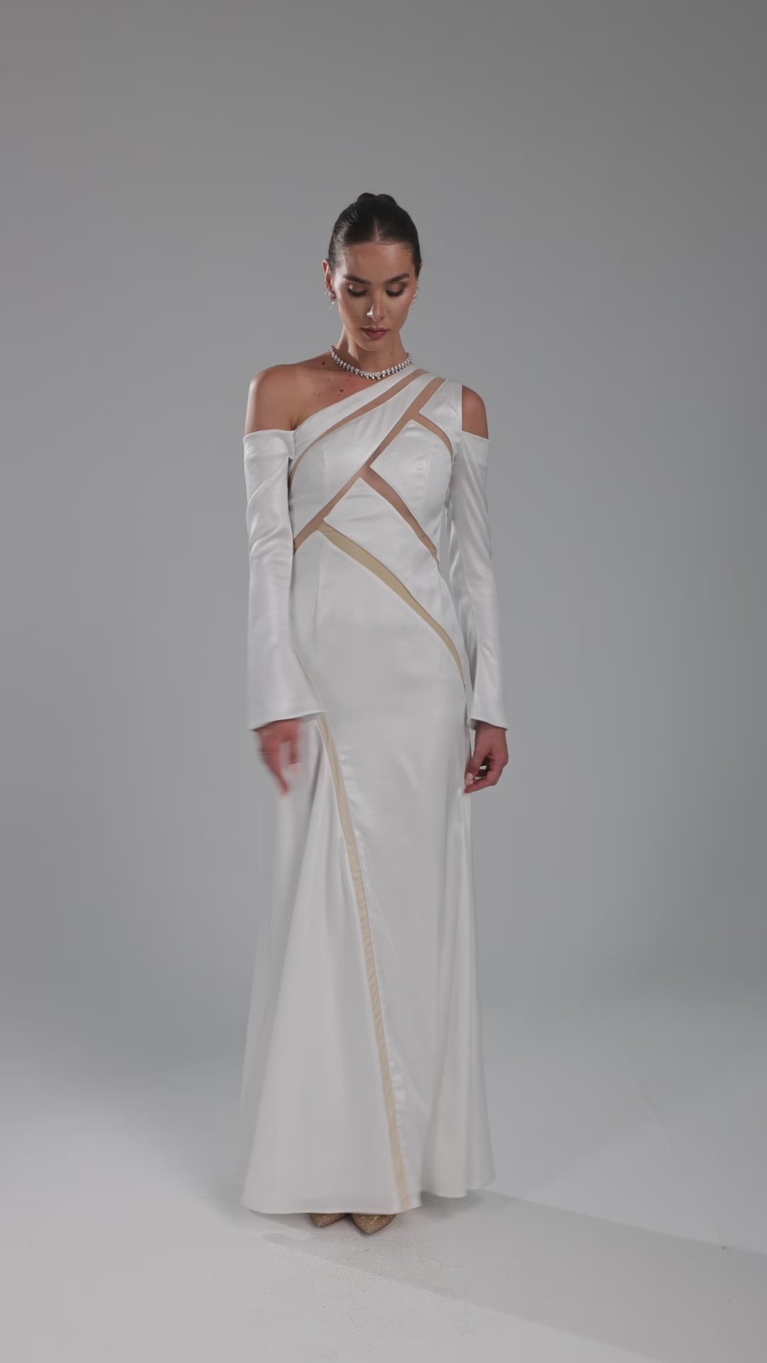 This dress is crafted from shiny satan fabric. The corsage is constructed from sheer, skin-tone tulle — a barely-there base upon which architectural panels of shiny satin are precisely placed, forming a striking geometric composition that wraps and reveals in equal measure. The long fitted sleeves add a dramatic look.