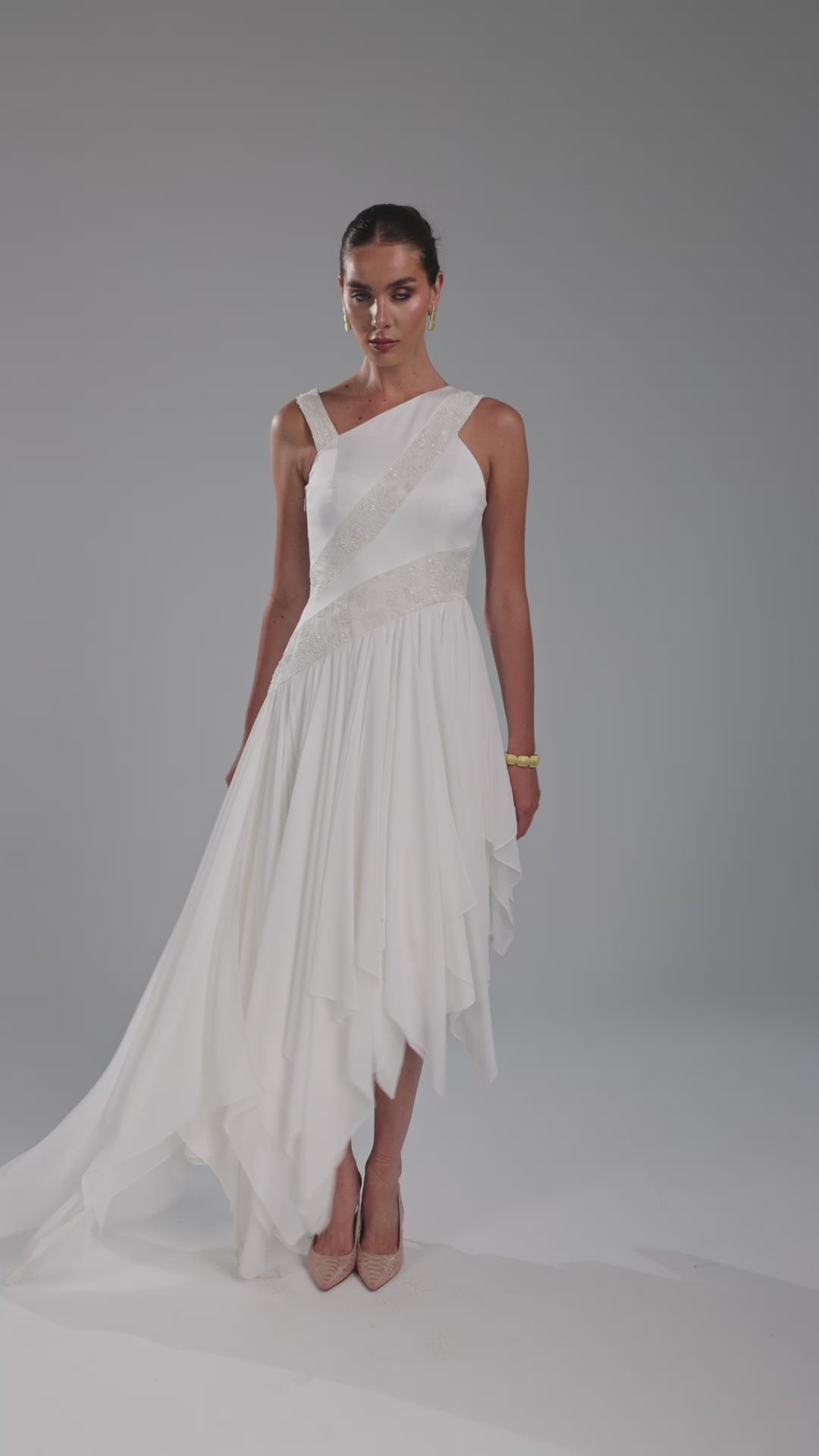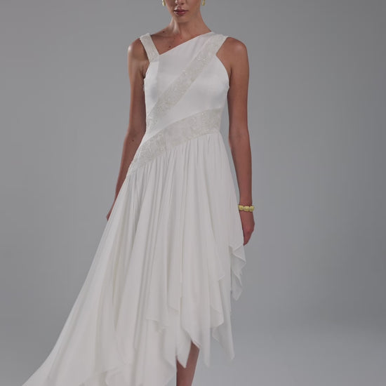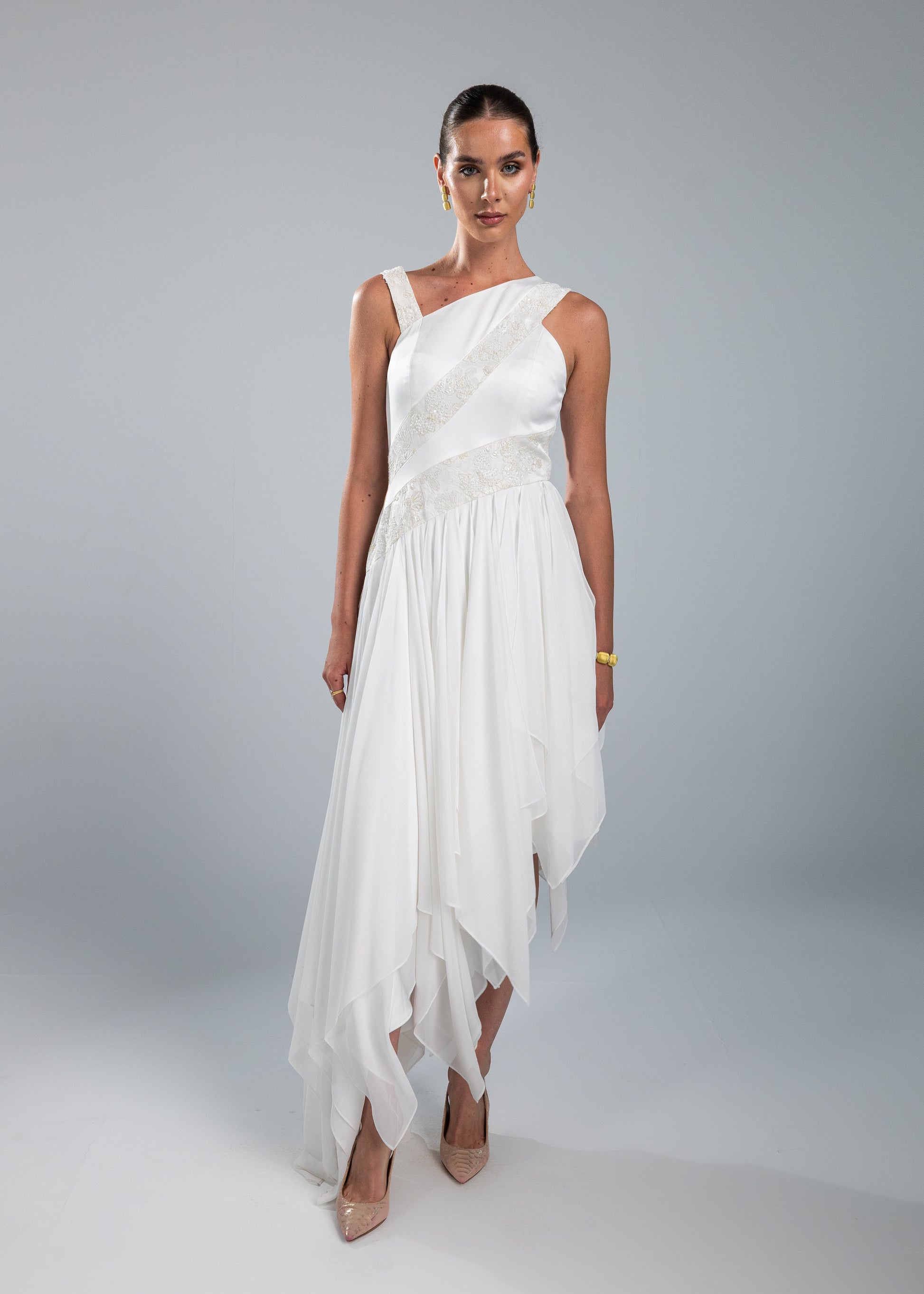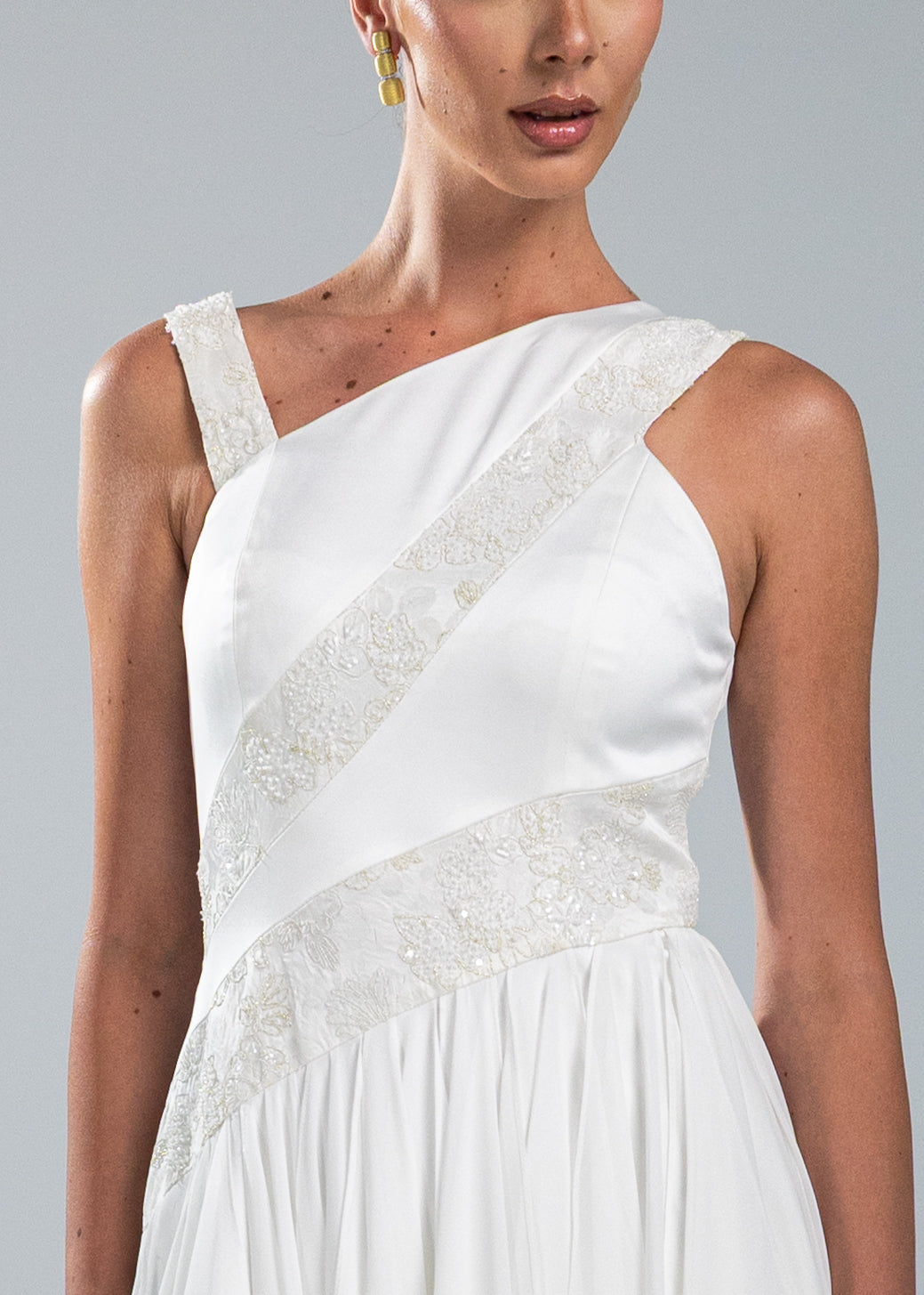 This dress is made from white satin and crepe chiffon. The one-shoulder bodice is sculpted and trimmed with delicate floral embroidered satin, wrapping diagonally across the figure with quiet precision. From the waistline, diamond-shaped chiffon panels fall in fluid layers, creating a skirt that ripples with every step like snow cascading down a cliff's edge.