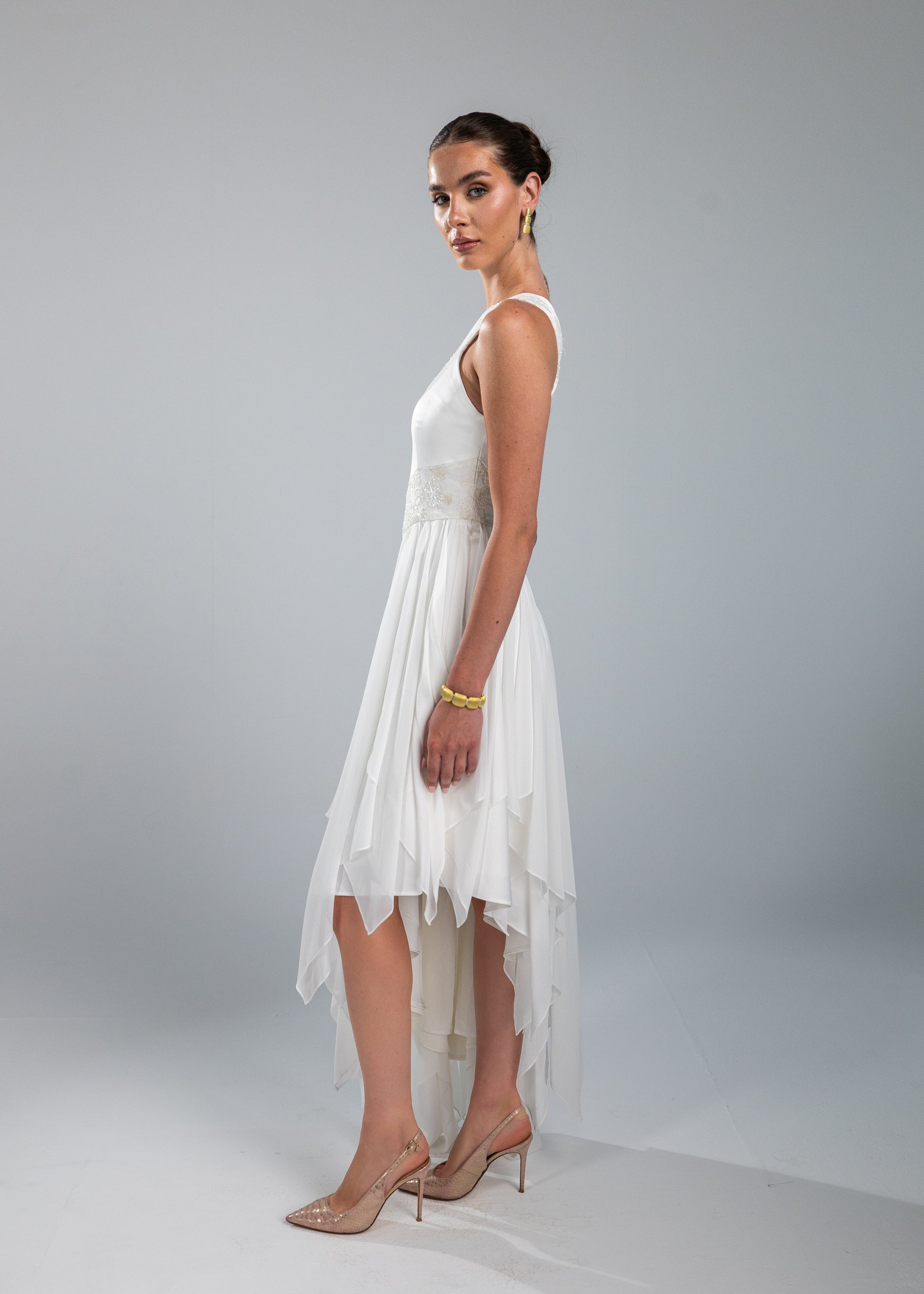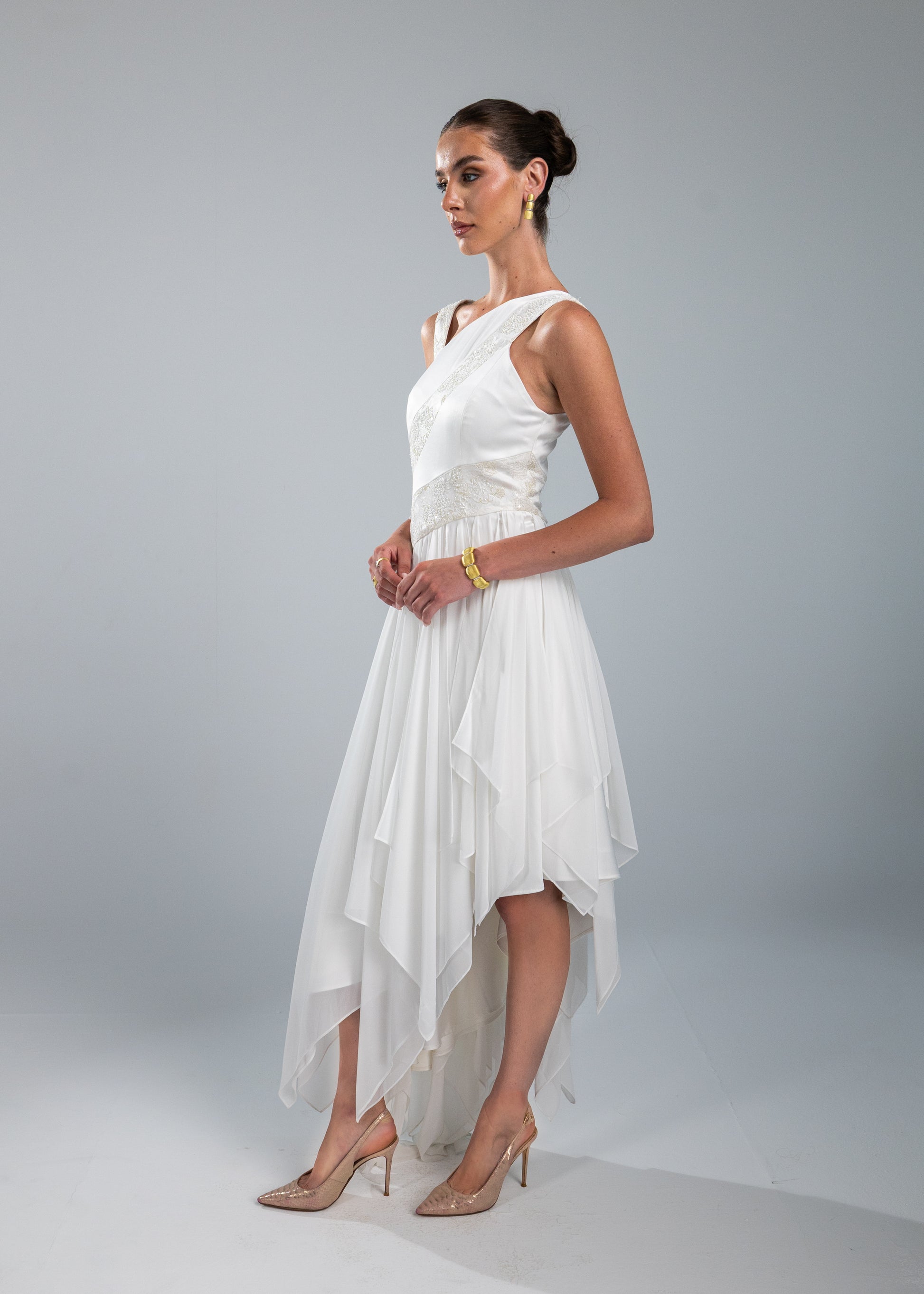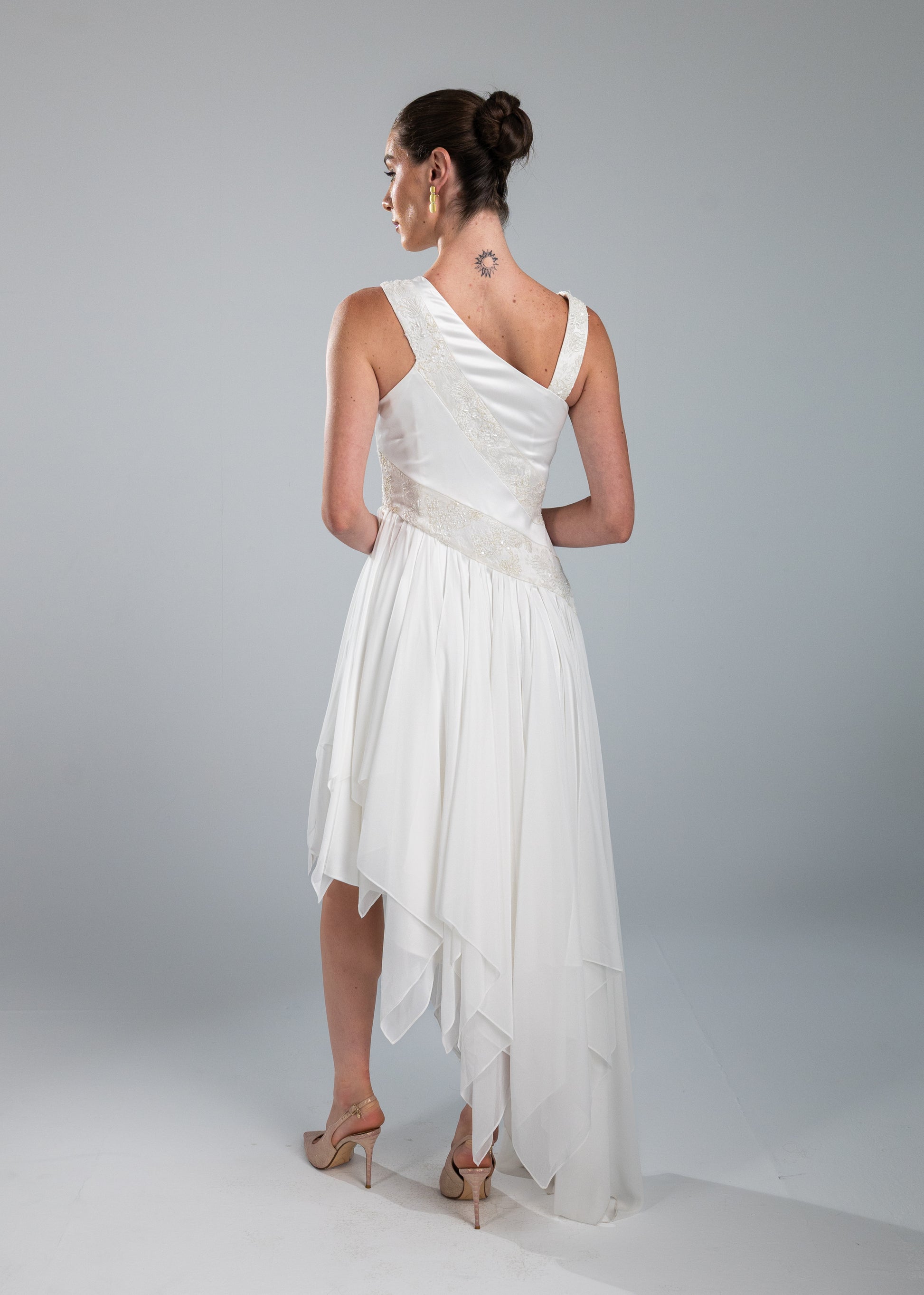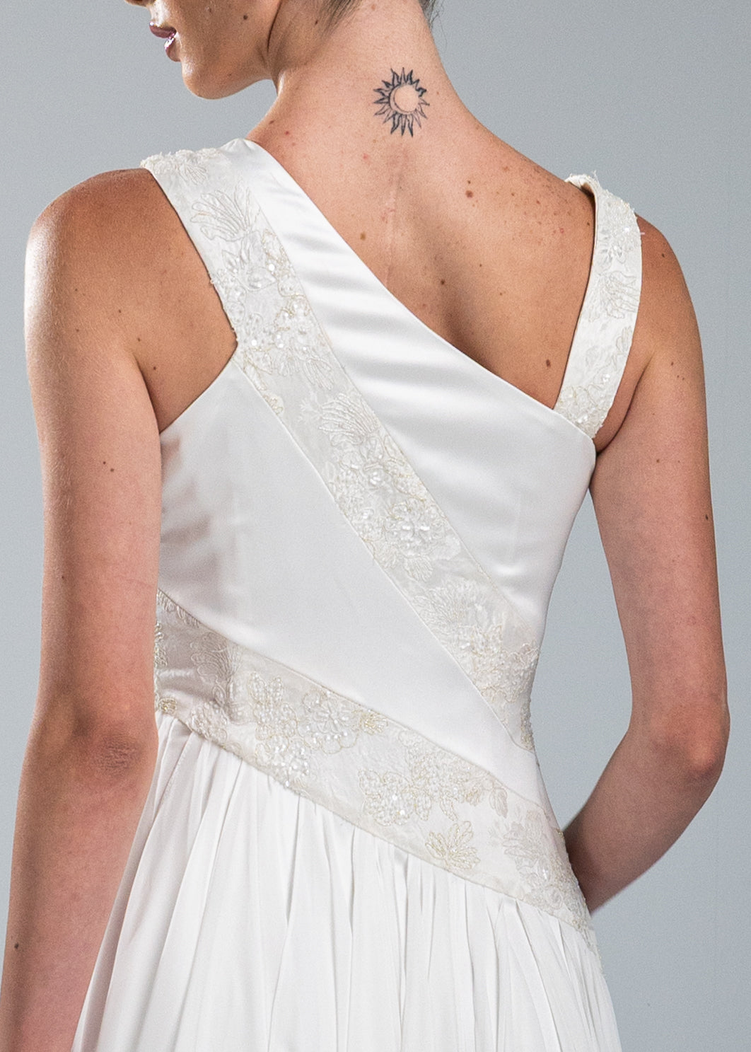 This dress is made from white satin and crepe chiffon. The one-shoulder bodice is sculpted and trimmed with delicate floral embroidered satin, wrapping diagonally across the figure with quiet precision. From the waistline, diamond-shaped chiffon panels fall in fluid layers, creating a skirt that ripples with every step like snow cascading down a cliff's edge.