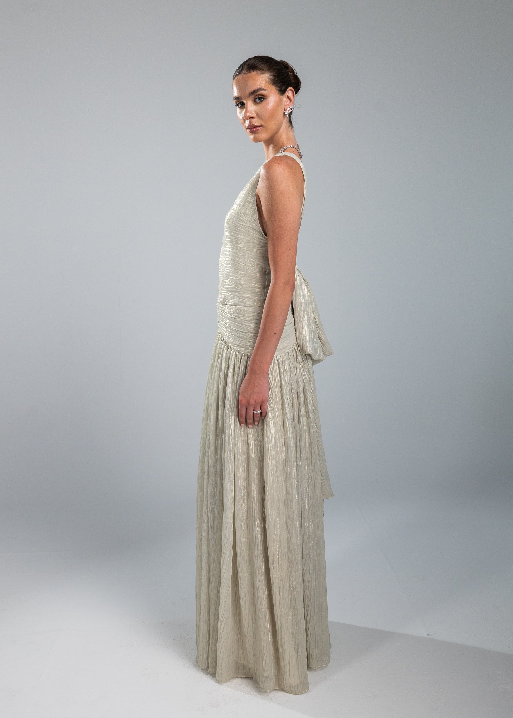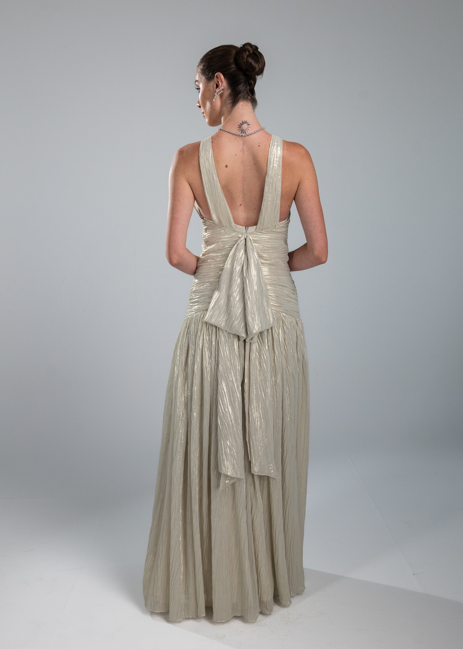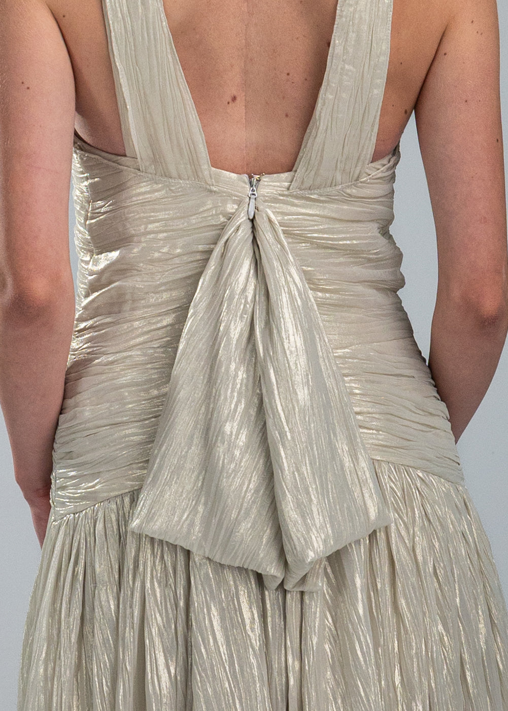 Crafted from a lightweight, crinkled metallic chiffon fabric. The bodice features a soft, relaxed silhouette with deep V-neckline that elongates the frame and at the hip line, the fabric is delicately gathered into a dropped waist seam, creating soft volume that opens into a full, floor-length skirt. The back is adorned by a softly draped bow that adds a feminine look to the address.