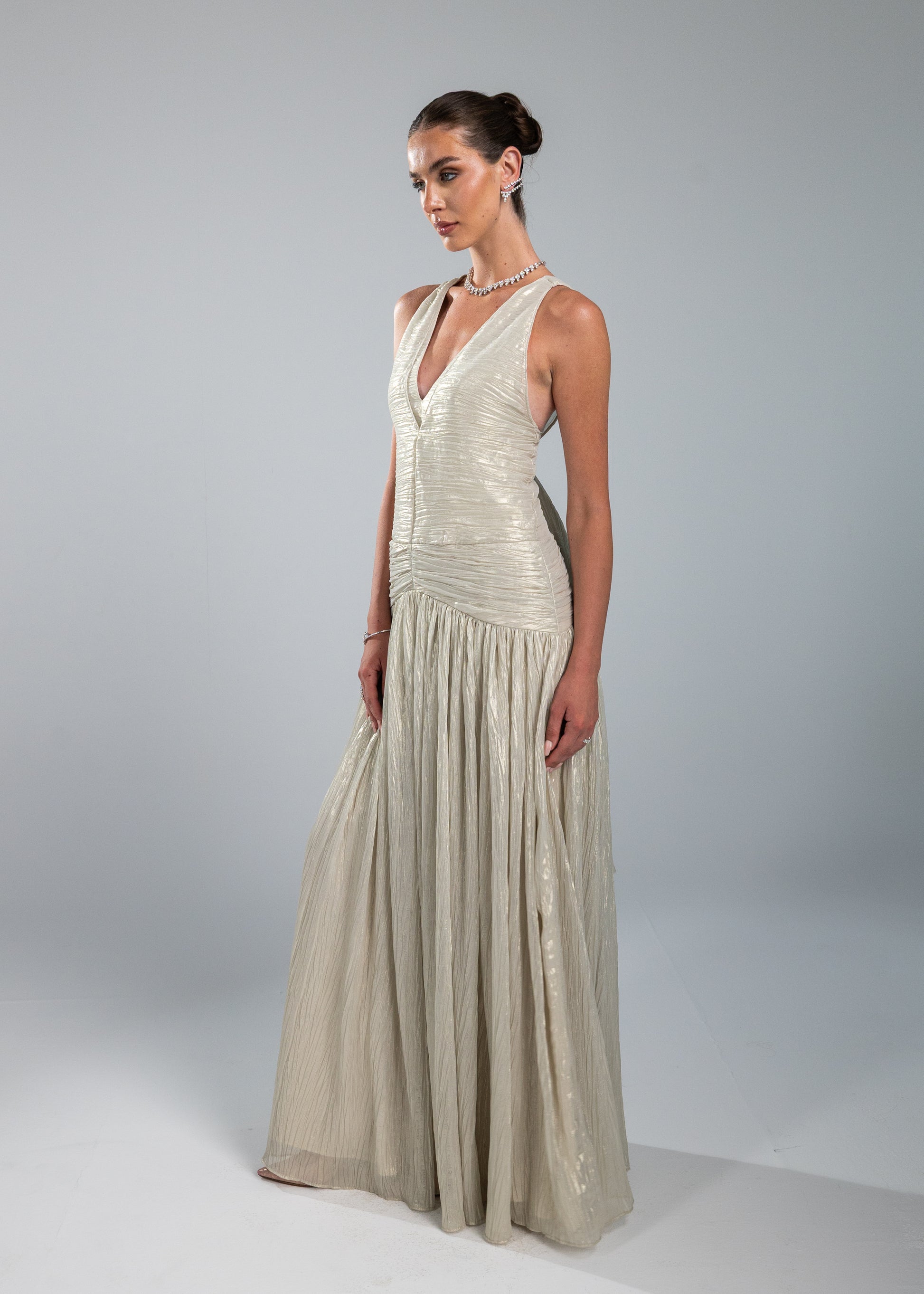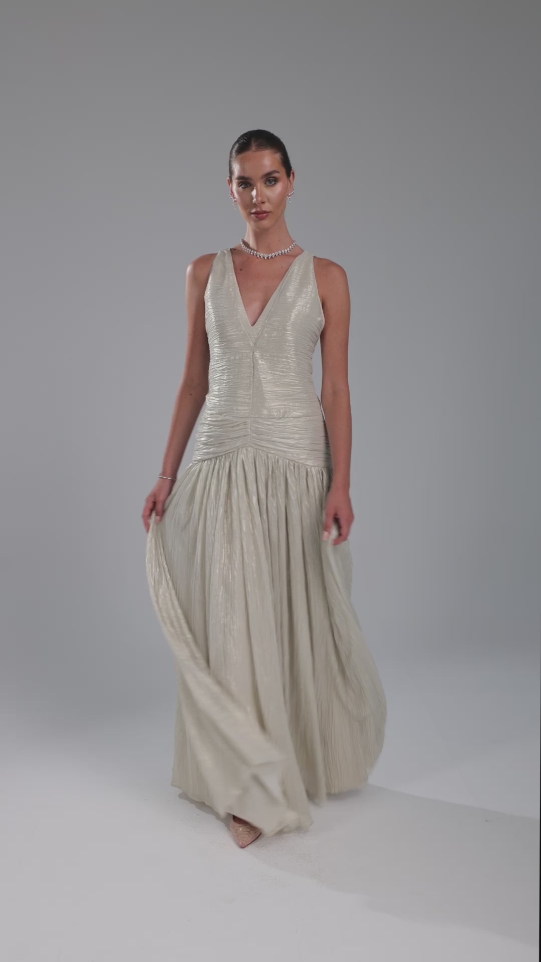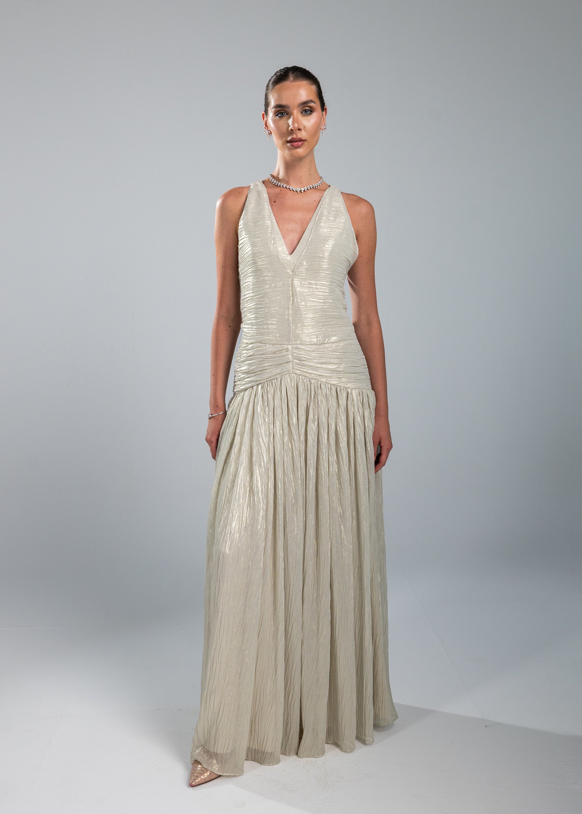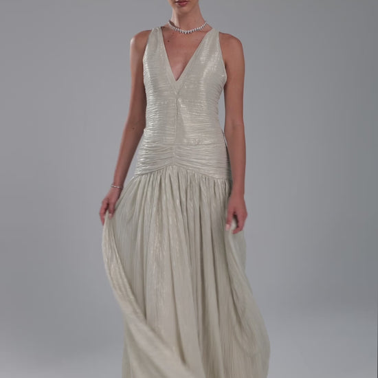 Crafted from a lightweight, crinkled metallic chiffon fabric. The bodice features a soft, relaxed silhouette with deep V-neckline that elongates the frame and at the hip line, the fabric is delicately gathered into a dropped waist seam, creating soft volume that opens into a full, floor-length skirt. The back is adorned by a softly draped bow that adds a feminine look to the address.