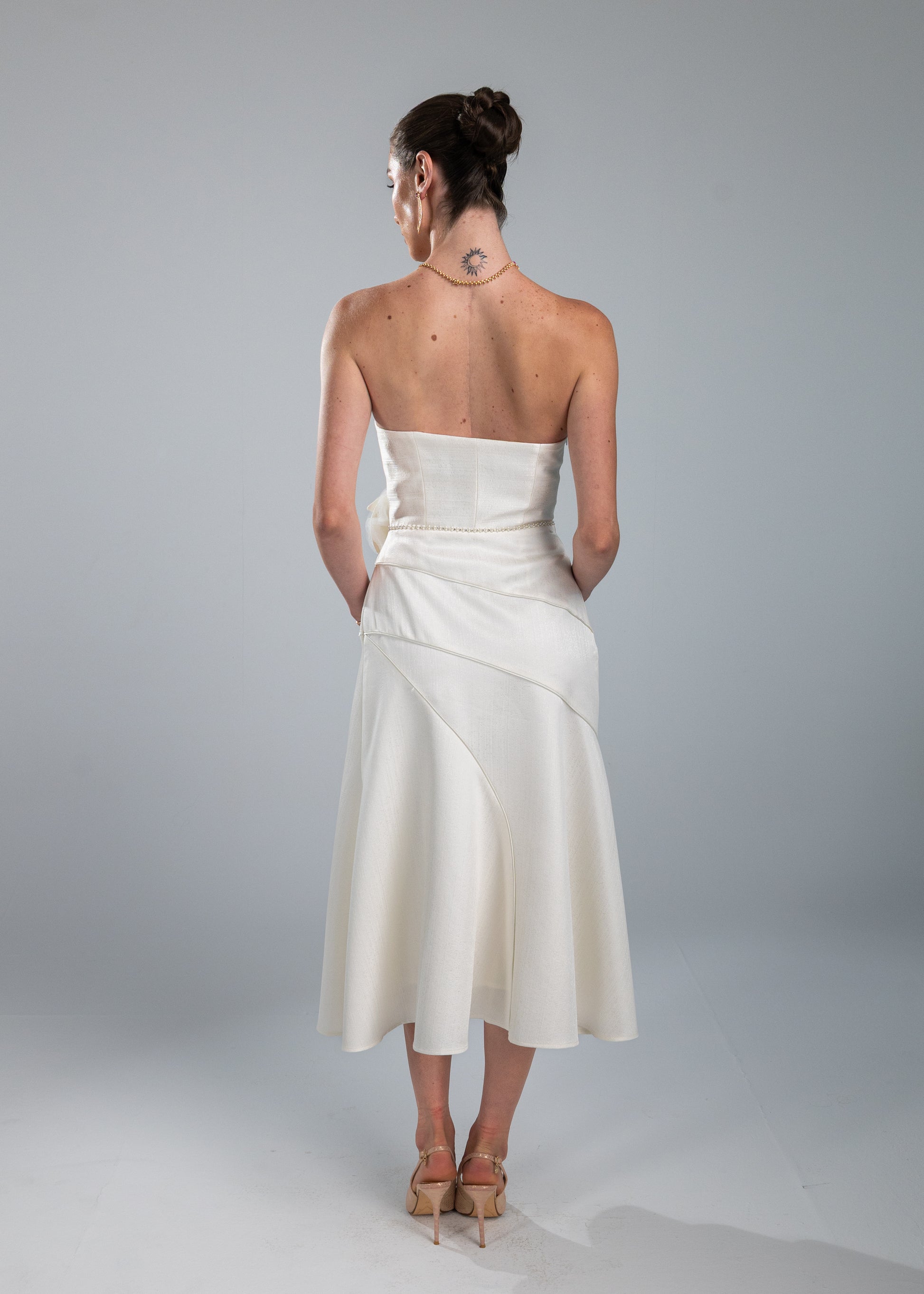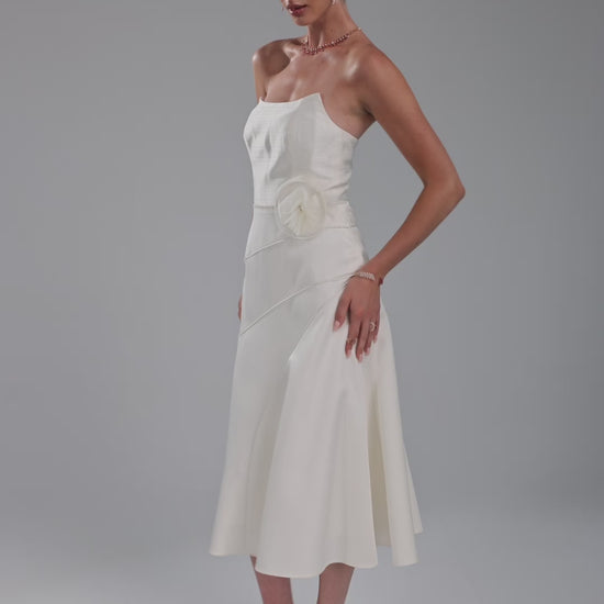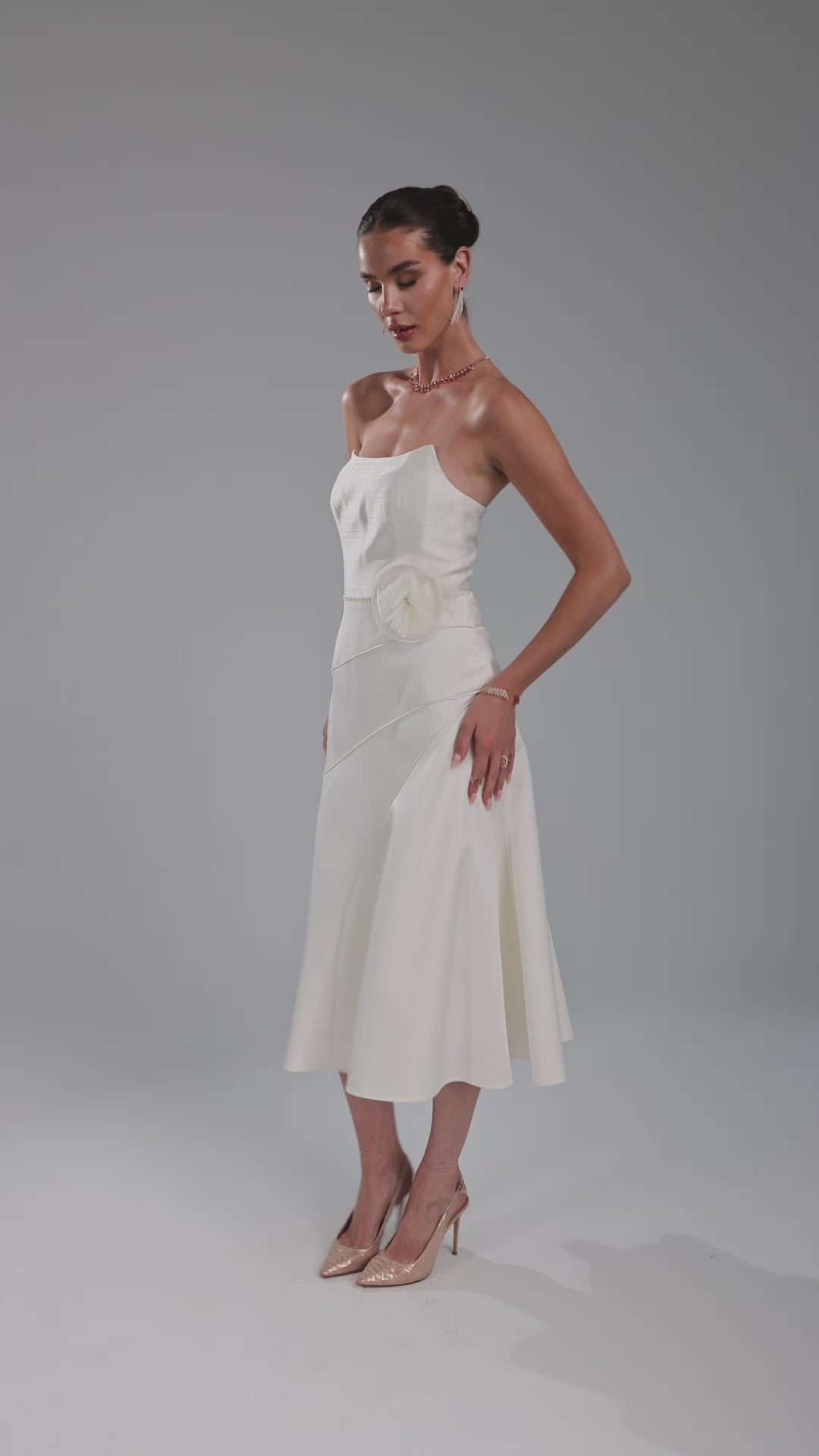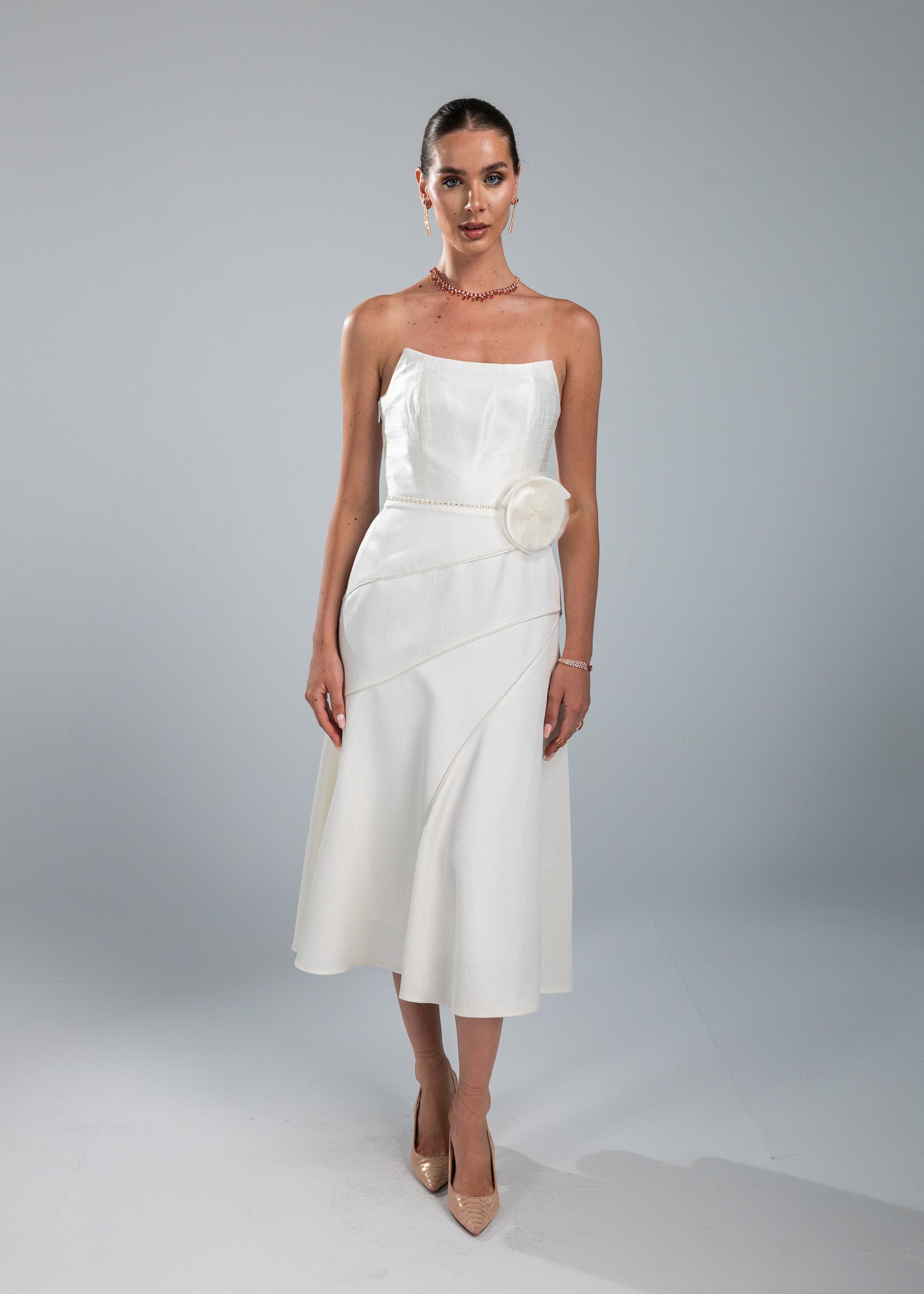 Mid length dress with structured siloutte made from textured off-white satin fabric. A delicate line of pearl embroidery wraps the waist and adorned with soft satin and tulle flower. The flared skirt flows in clean diagonal panels, outlined by fine satin piping that adds understated movement to the architectural lines of the dress.