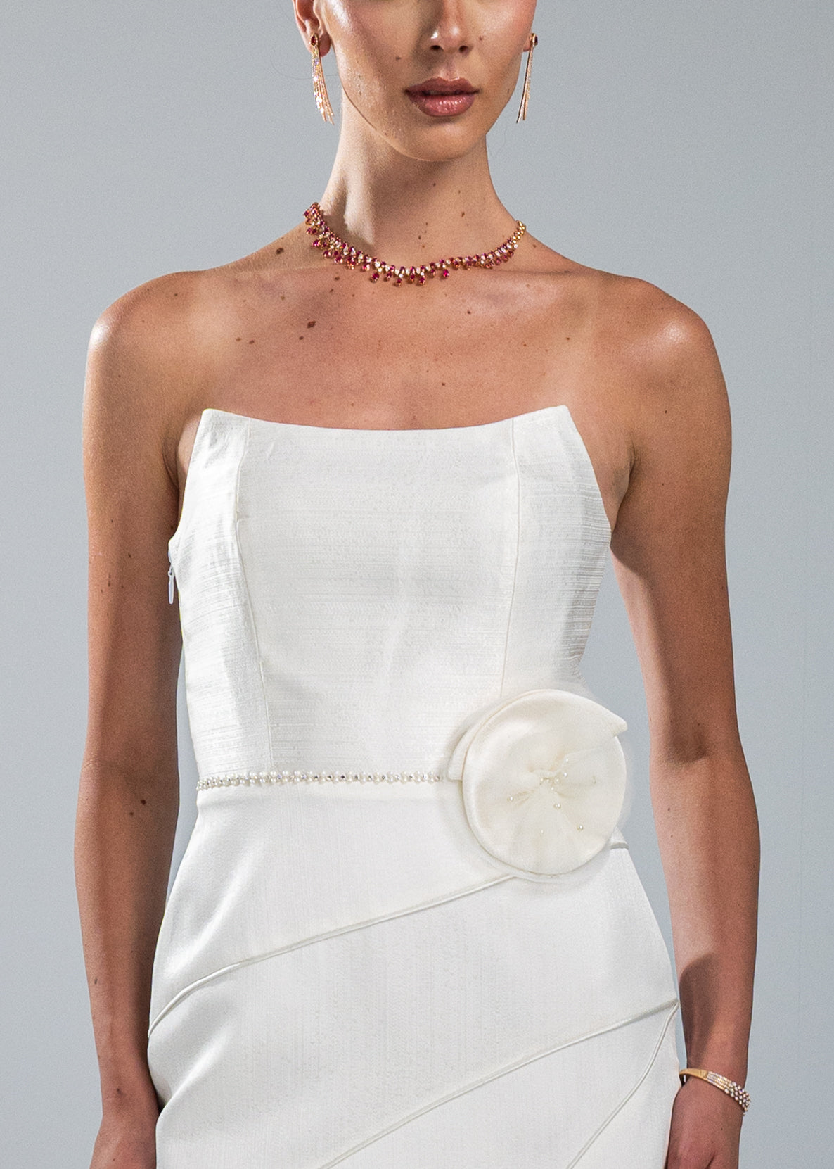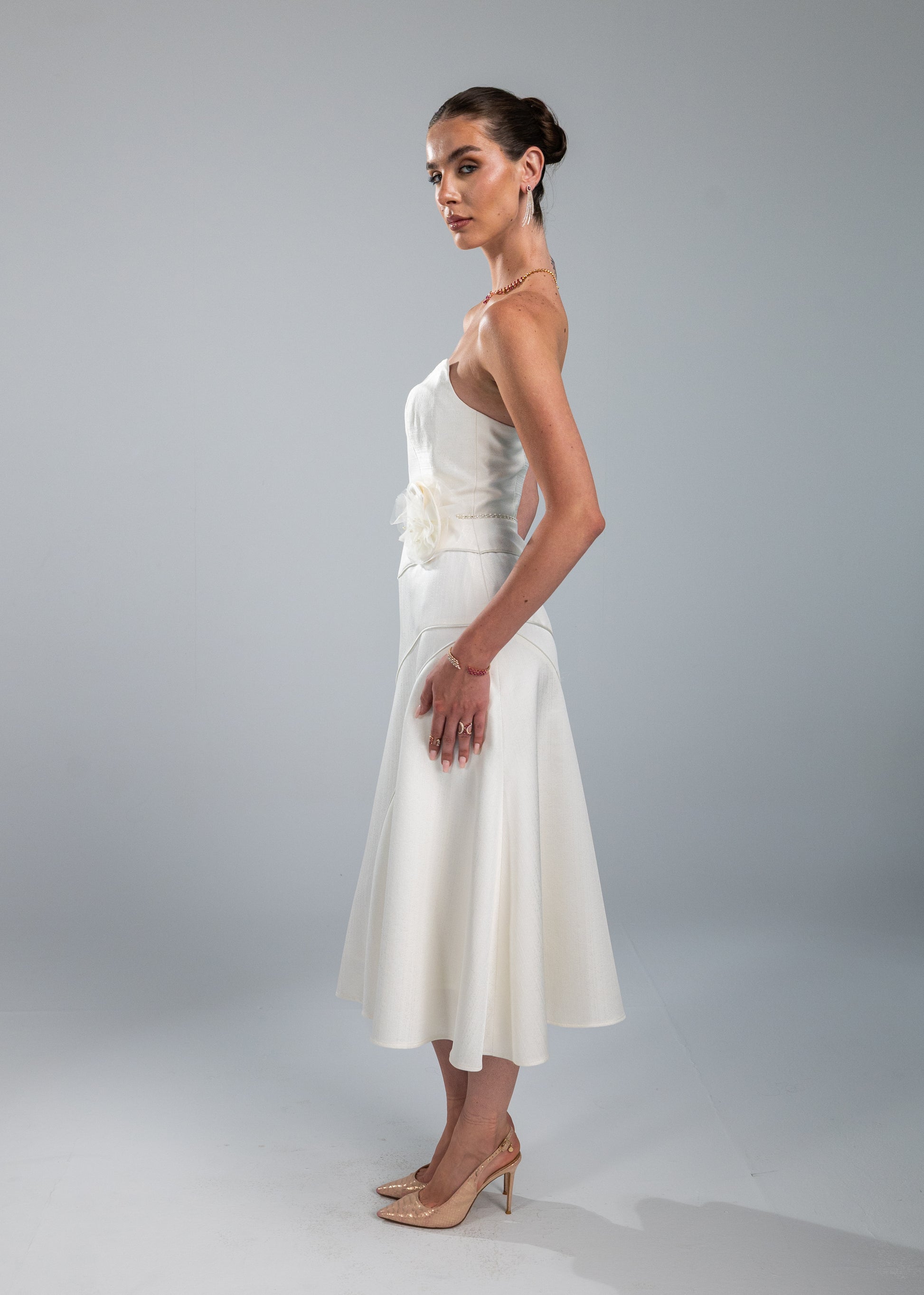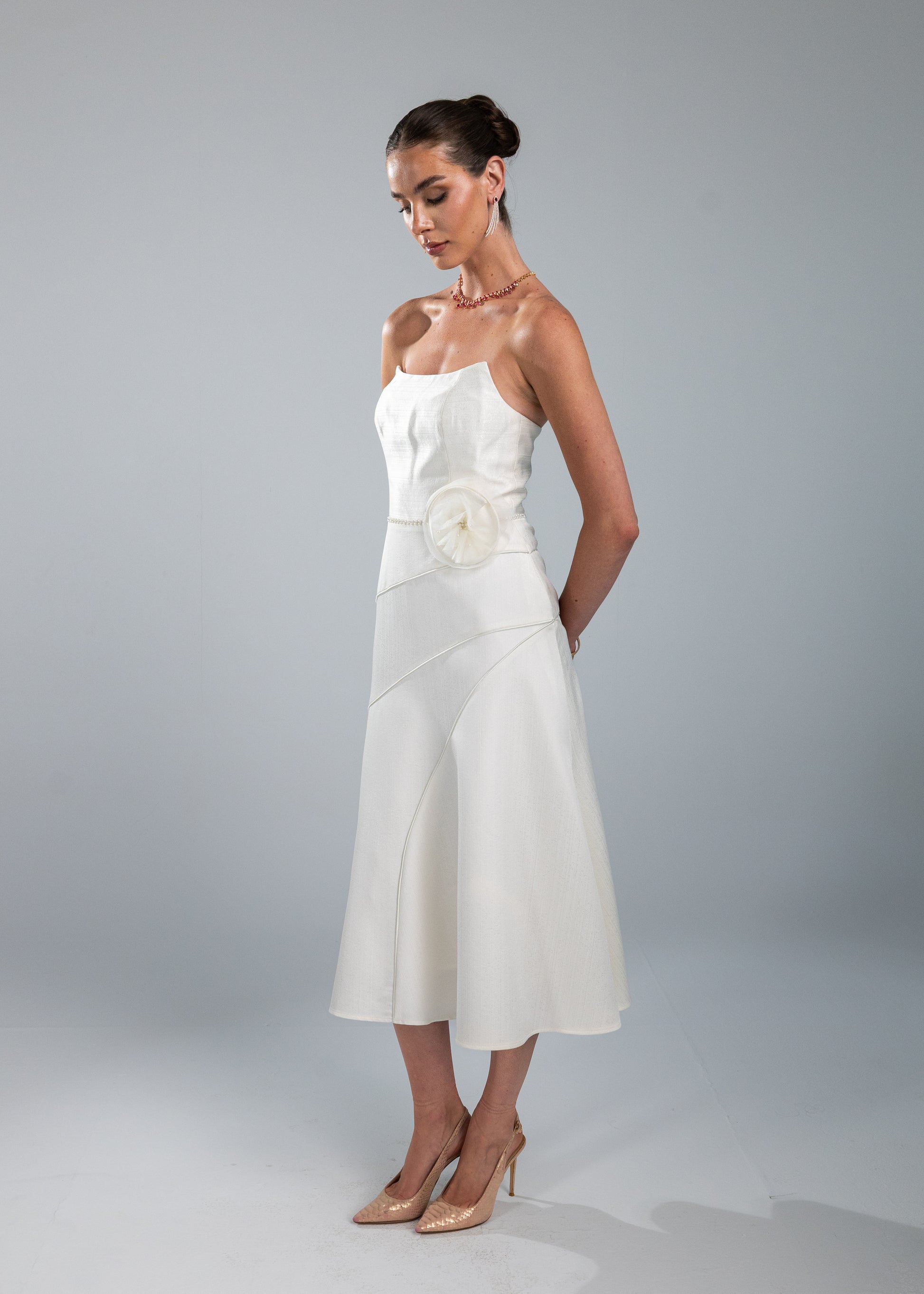 Mid length dress with structured siloutte made from textured off-white satin fabric. A delicate line of pearl embroidery wraps the waist and adorned with soft satin and tulle flower. The flared skirt flows in clean diagonal panels, outlined by fine satin piping that adds understated movement to the architectural lines of the dress.