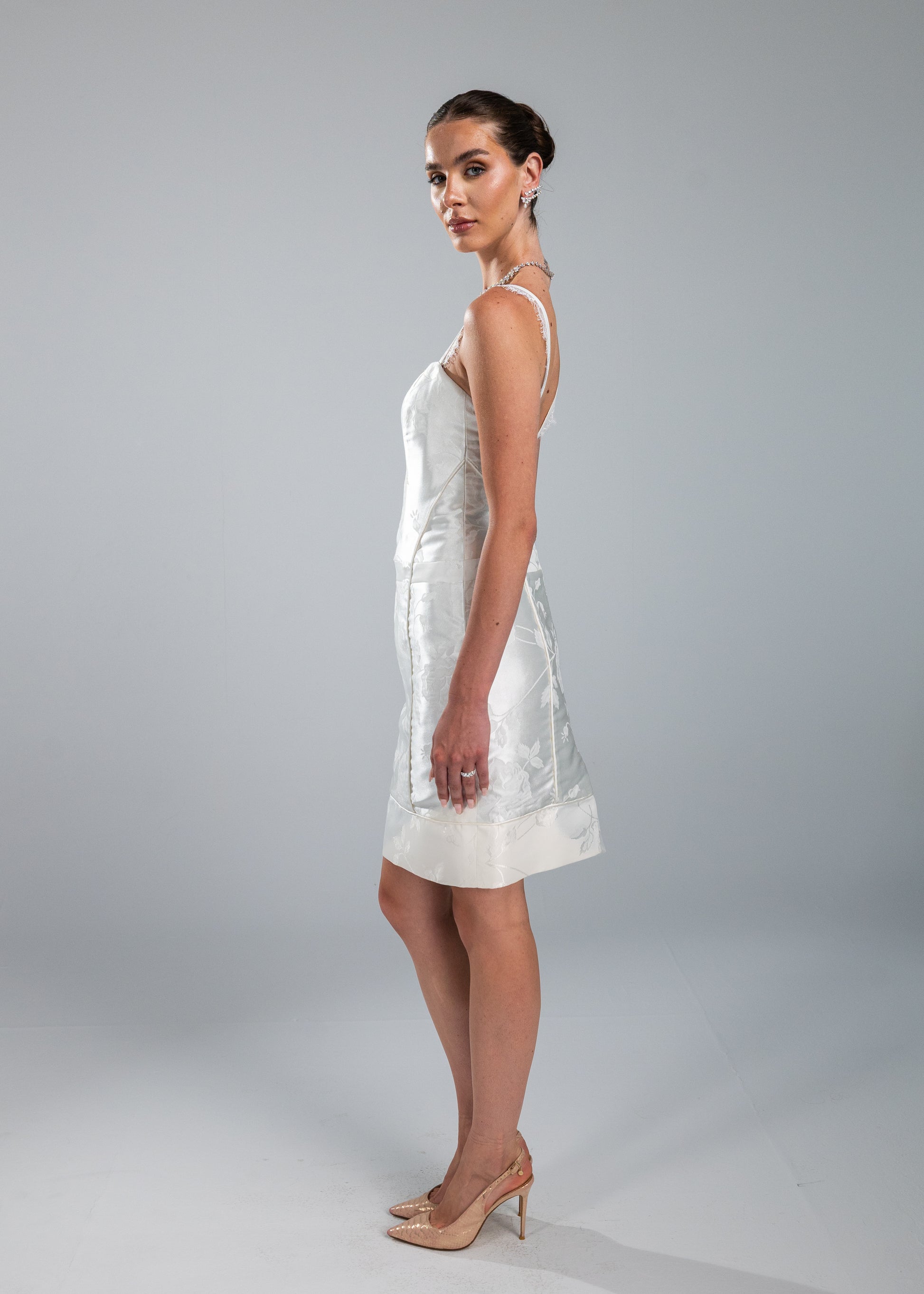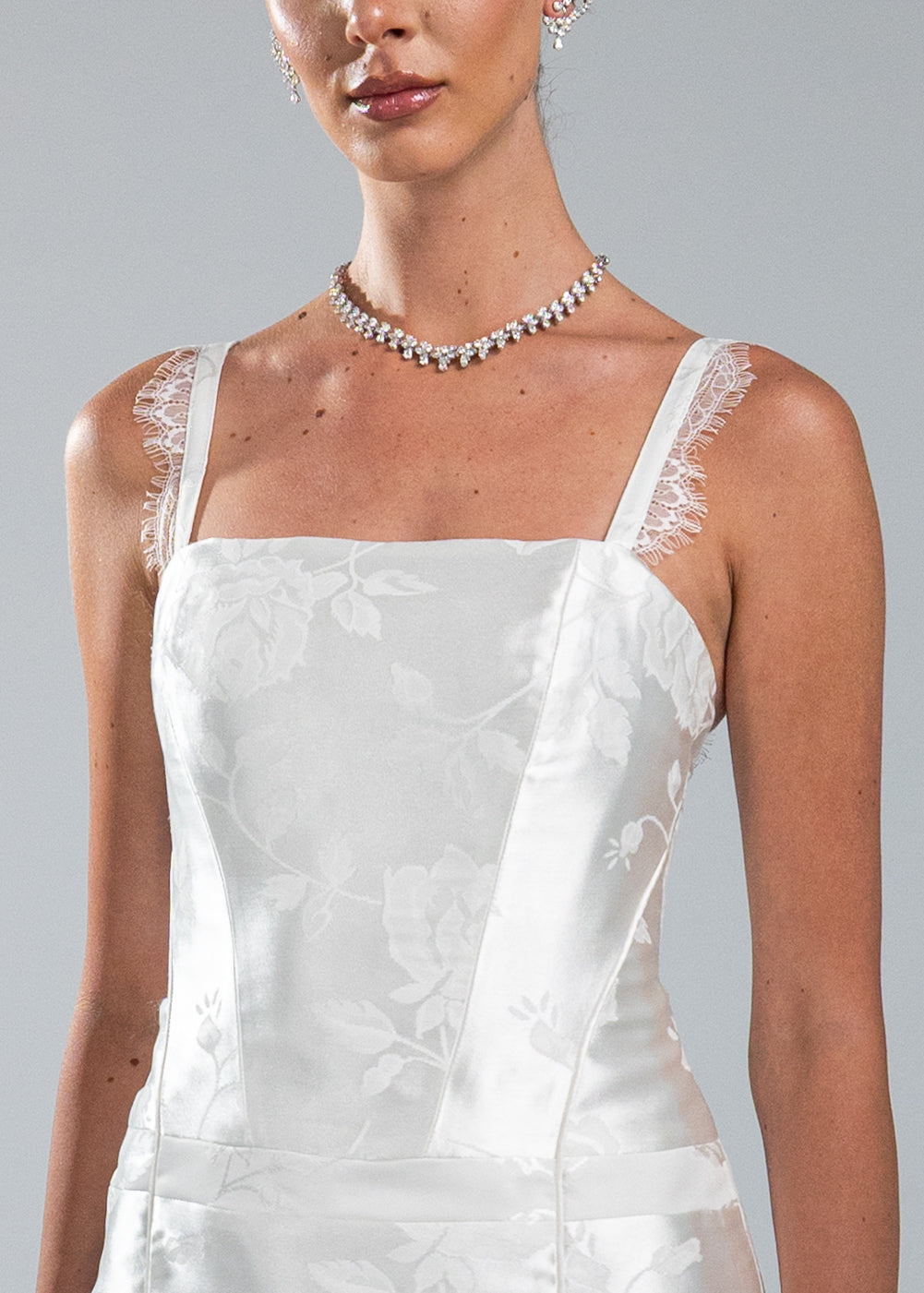 Lucera is made from luminous jacquard satin, woven in floral motif that subtly catches the light with every movement.