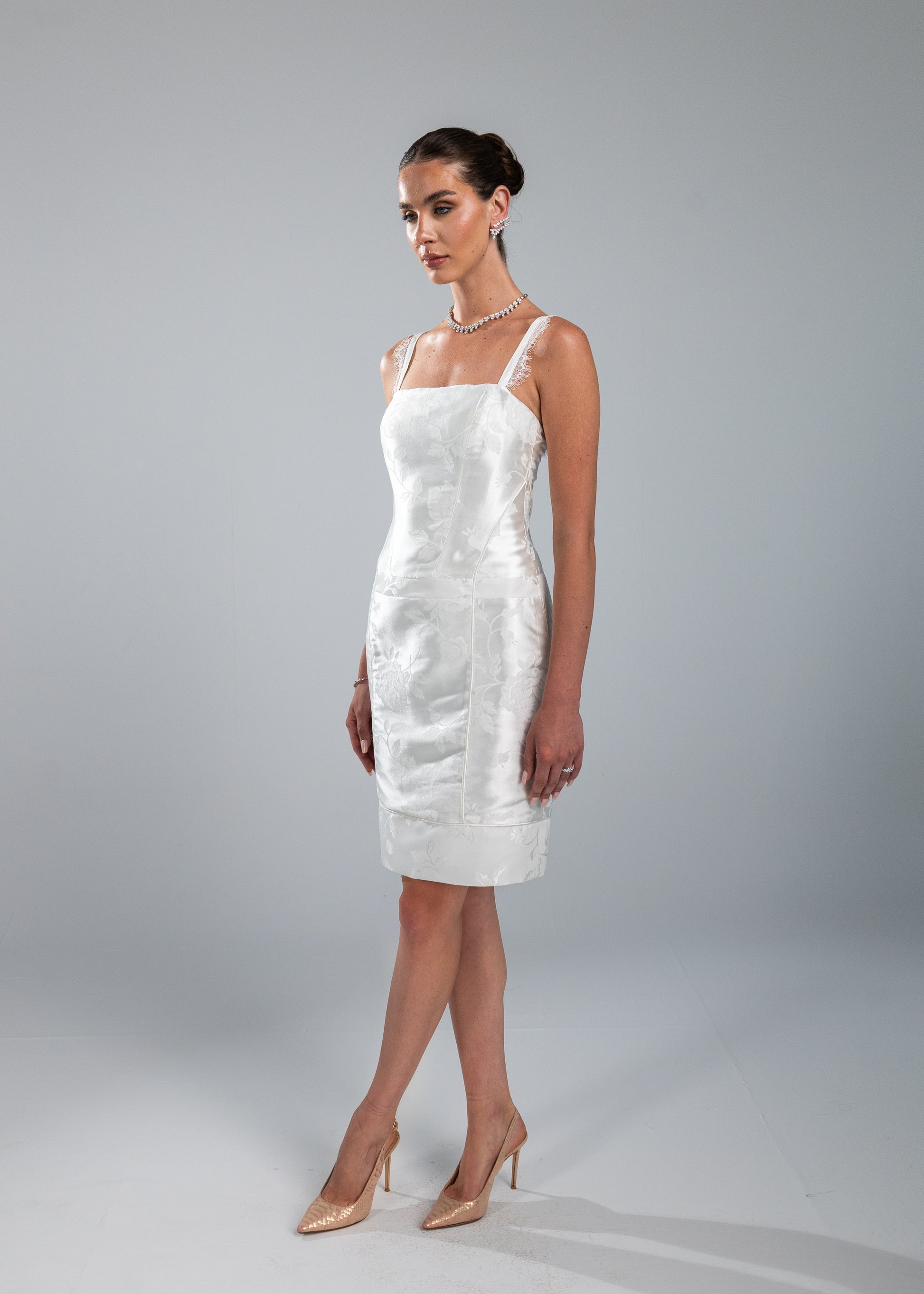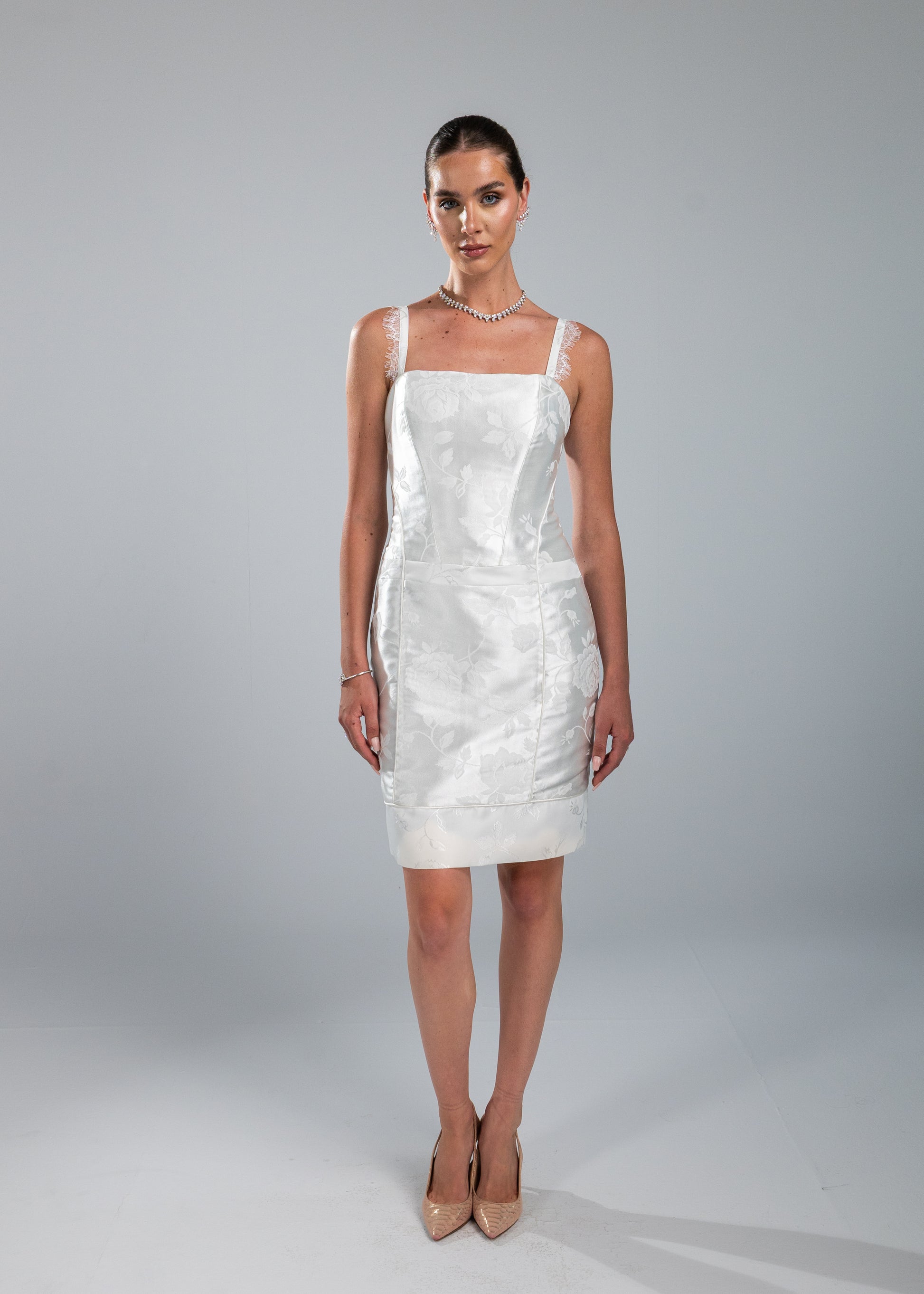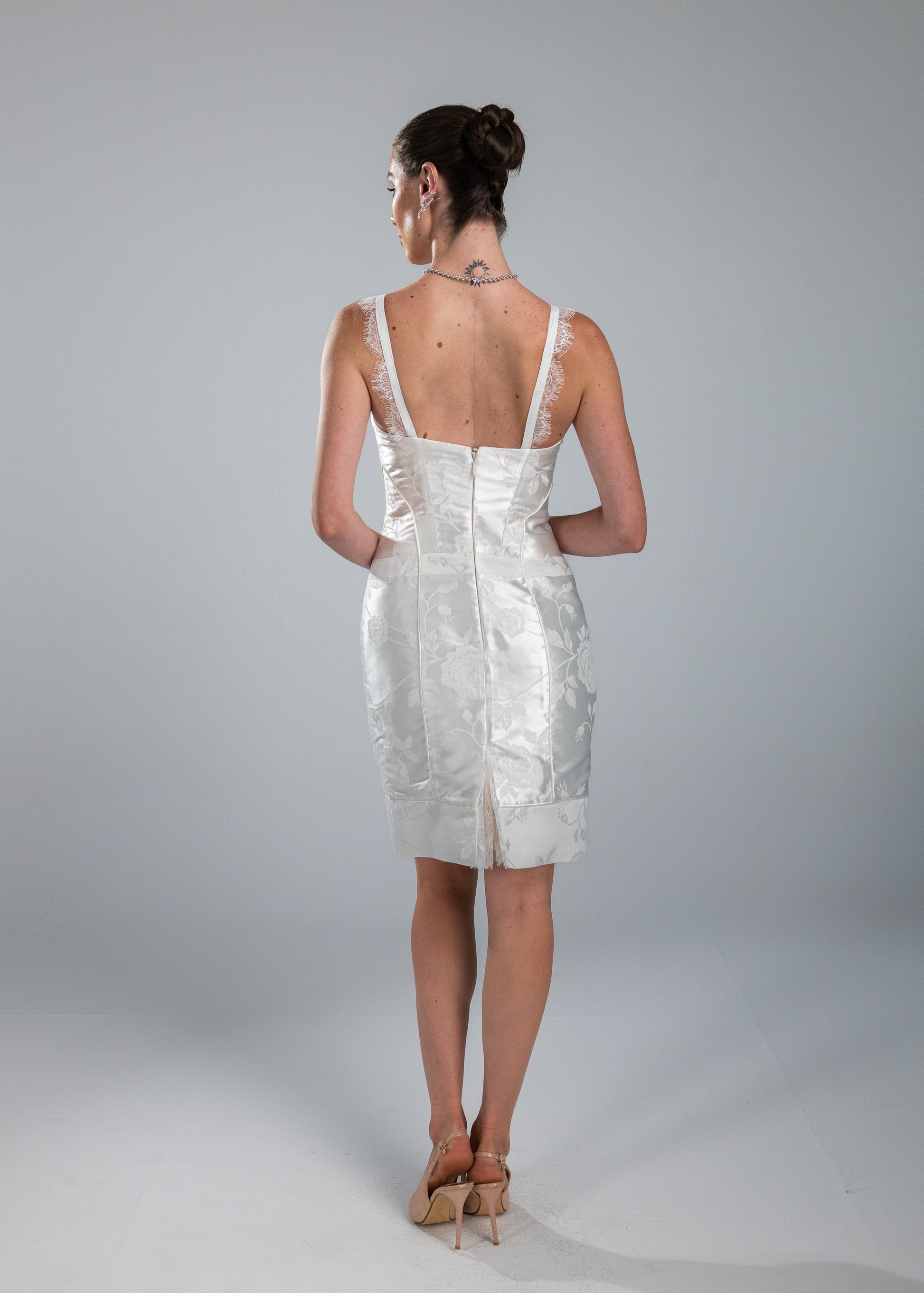 The corsage is shaped by elongated vertical seams that flatter the figure. Soft lace-trimmed shoulder straps, square neckline for a contemporary edge. The skirt falls to just above the knee in a tailored pencil silhouette offering a balance of elegance and ease.