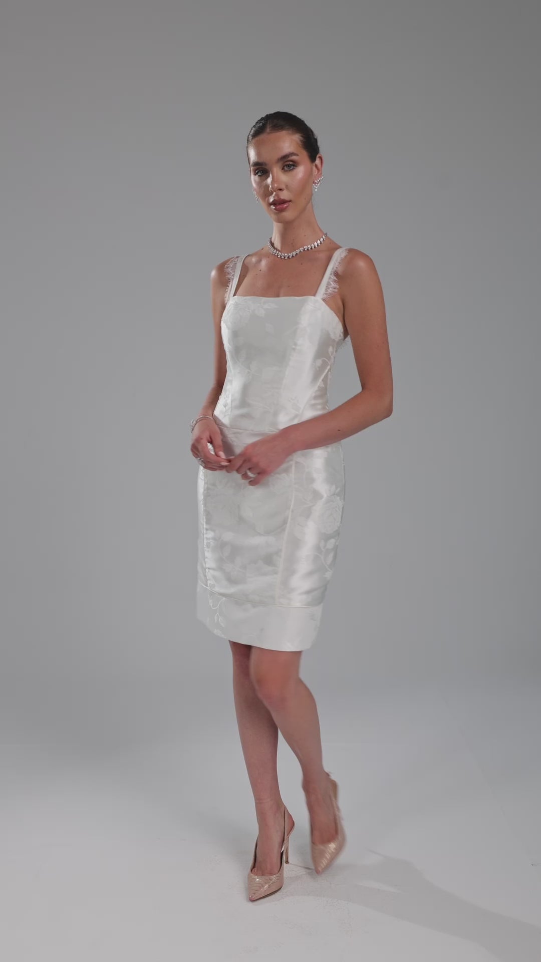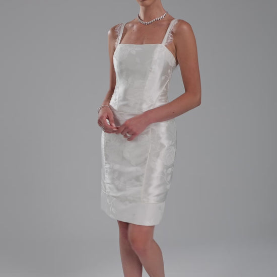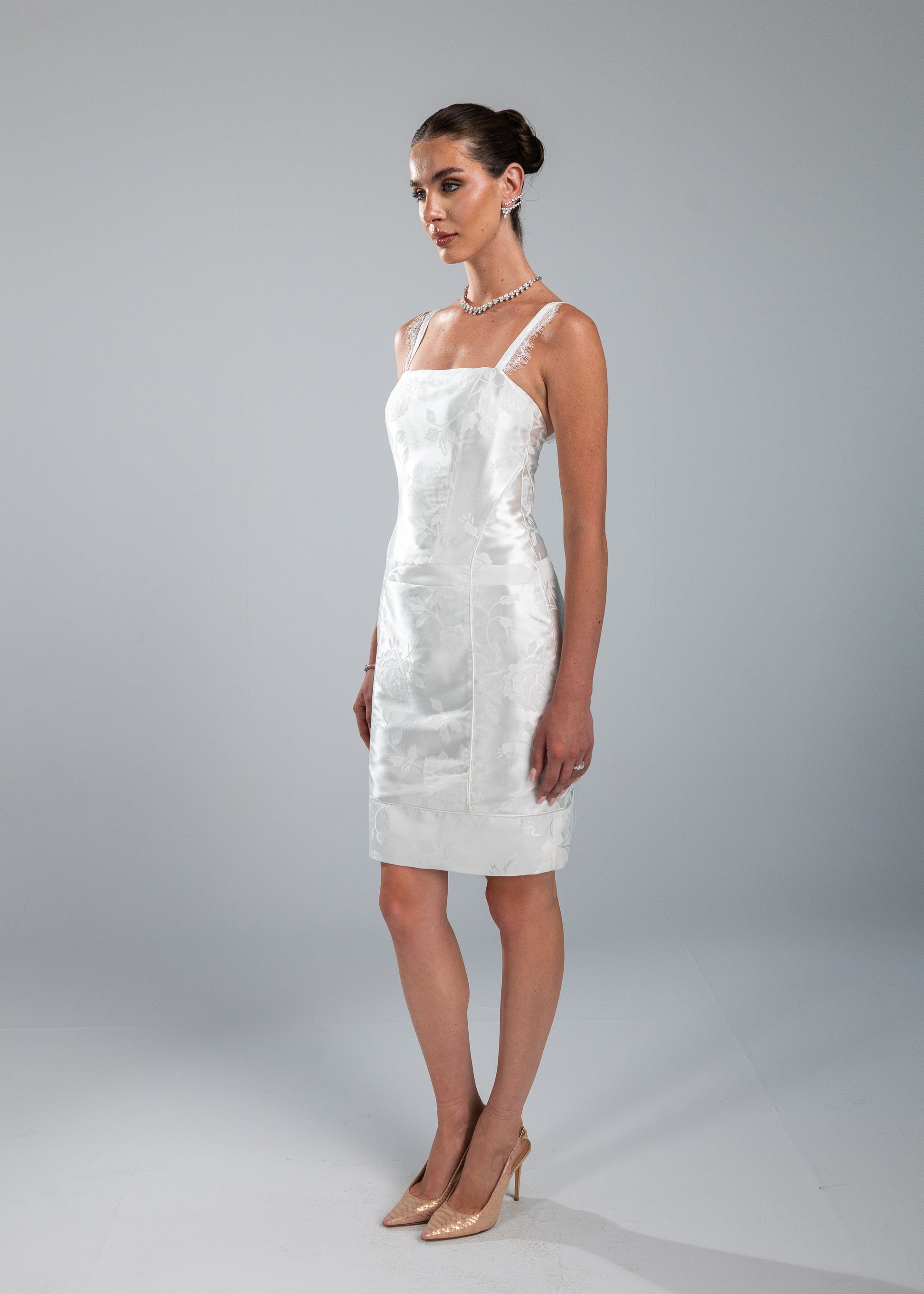 The corsage is shaped by elongated vertical seams that flatter the figure. Soft lace-trimmed shoulder straps, square neckline for a contemporary edge. The skirt falls to just above the knee in a tailored pencil silhouette offering a balance of elegance and ease.