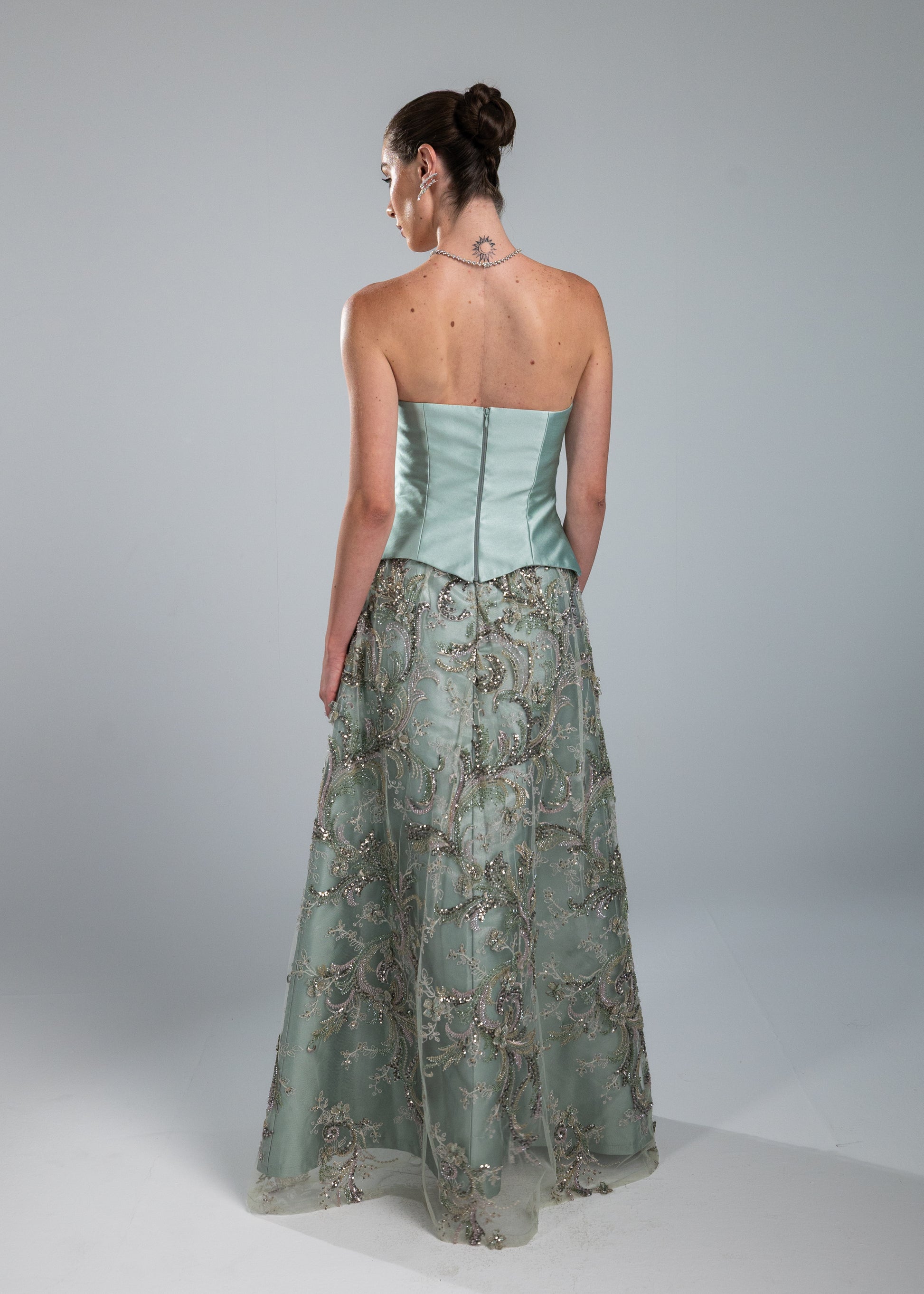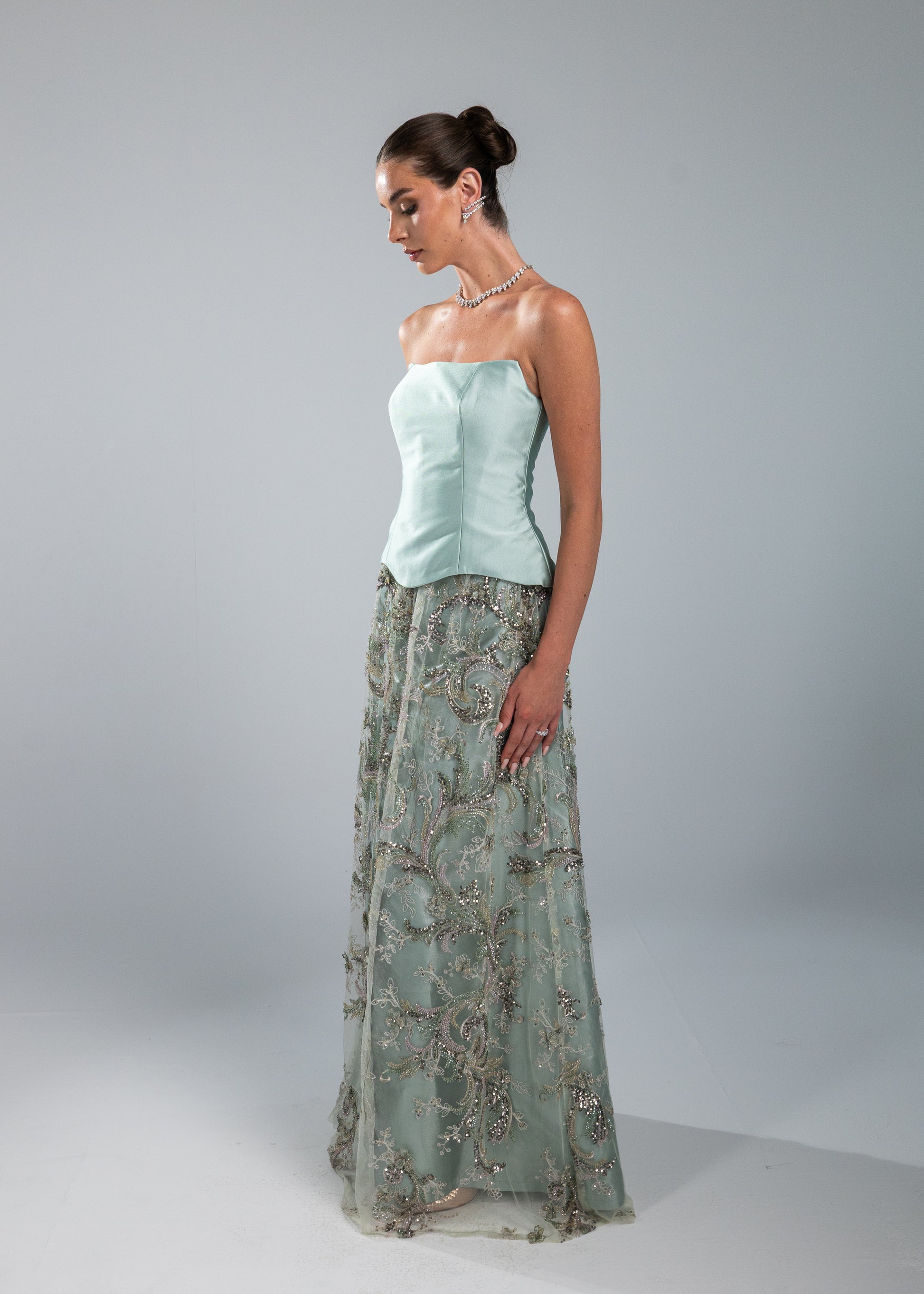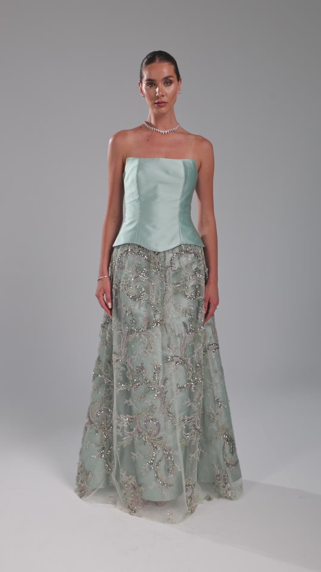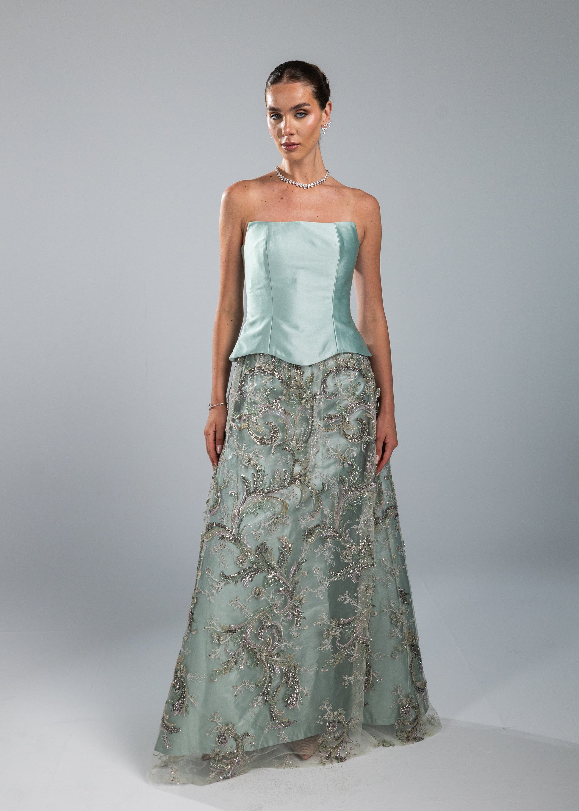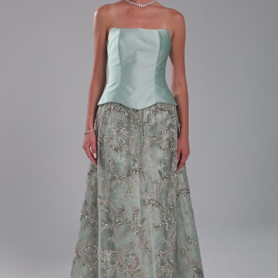 The strapless bodice is crafted in glossy ice-mint satin, structured with clean seams and a subtle flare at the hem creating a flattering hourglass silhouette with modern edge.