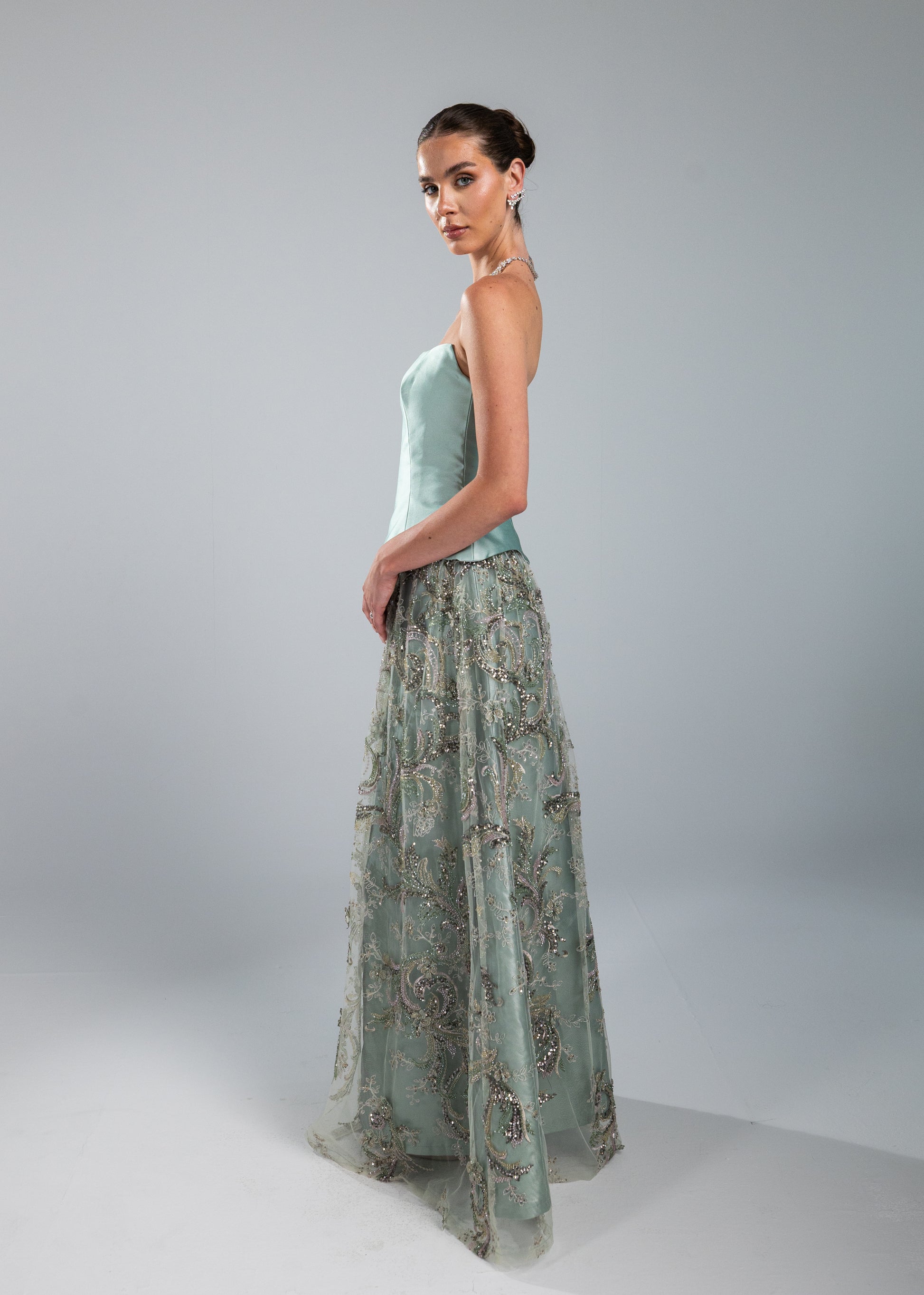 The skirt unfolds in a full A-line shape, crafted from layers of soft tulle richly embroidered with glistening silver and champagne beading.